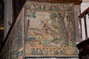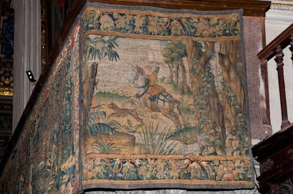 - NOTIZIE STORICO CRITICHE L'arazzo in esame, raffigurante un episodio di caccia, costituisce un frammento indipendente dai cicli presenti in basilica.\nL'opera, che proviene probabilmente da una manifattura di Bruxelles attiva sulla metà del XVI secolo, fu acquistata dai deputati della Misericordia Maggiore tra il 1627 e il 1672.