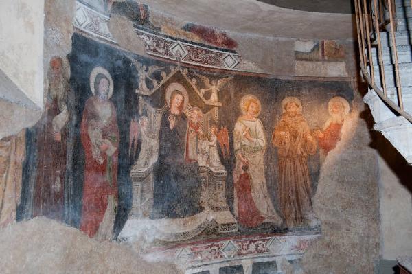 - NOTIZIE STORICO CRITICHE L'affresco è considerato coevo e dello stesso maestro di quello posto sul lato sinistro recante l'iscrizione con la data 1336 (num. foto 1051). Entrambi raffigurano il medesimo soggetto differenziato solo nella scelta dei santi (Zanchi, 2003). Nella scena i personaggi sono definiti da contorni ben marcati e caratterizzati da un realismo di chiara ascendenza lombarda. Pennellate rapide e sommarie si alternano a una descrizione minuziosa dei particolari.\nI dipinti dell'absidiola sud-occidentale vennero portati alla luce nel 1950. L'anno successivo l'Ente Comunale di Assistenza già Misericordia Maggiore affidò il restauro (del quale non è stata reperita alcuna documentazione negli archivi della MIA) ad Arturo Cividini. In quell'occasione fu scoperta l'iscrizione ai piedi del primo gruppo pittorico recante la data 1336.\nLa differenza stilistica e cronologica dei dipinti del registro inferiore da quelli del registro superiore dell'absidiola sud-occidentale ha permesso di definire due personalità artistiche indicate con i nomi di "Maestro del 1336" (a cui vengono attribuiti gli affreschi del registro inferiore, nn. inv. 1050-1051) e "Maestro dell'Adorazione dei Magi" (a cui vengono attribuiti gli affeschi del registro superiore inzialmente riferiti dubitativamente a Pacino da Nova, nn. inv. 1052-1054).\nL'affresco è rifinito in alto e in basso da una sottile cornice con motivi a girali e motivi geometrici. Alla base è presente anche un motivo architettonico a dentelli. Al centro della scena la Madonna, assisa su un trono dalle linee gotiche, tiene sulle ginocchia il Bambino. Ai lati Sant'Antonio abate, San Giovanni Battista, San Giovanni Evangelista, un devoto inginocchiato, San Francesco d'Assisi e l'apostolo Andrea di cui si vede solo il volto. Del primo santo a sinistra è visibile solo la veste in quanto la parte superiore è stata demolita dall'apertura di una finestra centrale ("Affreschi trecenteschi", 2005, p. 41).\nL'opera è stata sottoposta ad un intervento di restauro nel 2006 (cfr. "Relazione dell'intervento di messa in sicurezza degli affreschi", 20 ottobre 2006).
