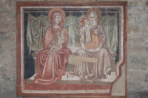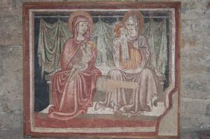 - NOTIZIE STORICO CRITICHE L'affresco riportato su tela, ora adagiato ai piedi di una trifora murata nel matroneo sud-occidentale, era precedentemente collocato nella sacrestia seicentesca della Basilica. Raffigura una scena non comune in quanto sono contemporaneamente rappresentate la Madonna che allatta il Bambino (a sinistra) e Sant'Elisabetta con San Giovanni Battista bambino (a destra) sedute su un'arca sepolcrale. L'opera, nonostante il carattere arcaico dei gesti, dei movimenti e del soggetto, è databile alla prima metà del XV secolo ("Affreschi trecenteschi", 2005, pp. 80-81).