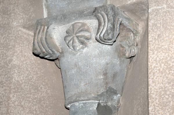 Capitello di colonna in pietra arenaria scolpita; abaco a facce piane; sotto gli spigoli fogliette con motivo a onde e, tra queste, al centro, rosette e fiori a cinque petali stilizzati.