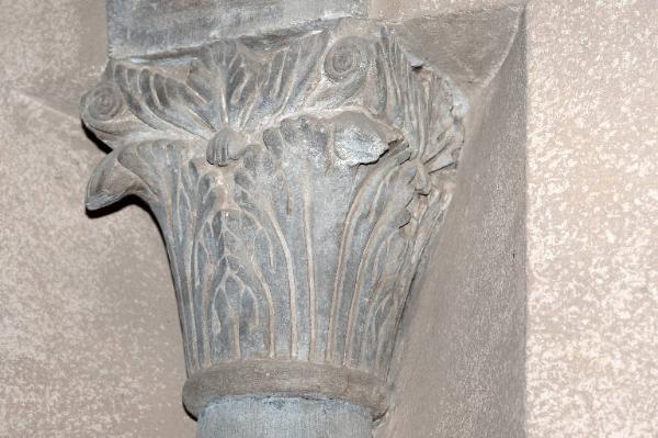 Capitello di colonna in pietra arenaria scolpita; motivi decorativi a foglie d'acanto con terminazioni estroflesse e livello superiore di caulicoli fogliati.