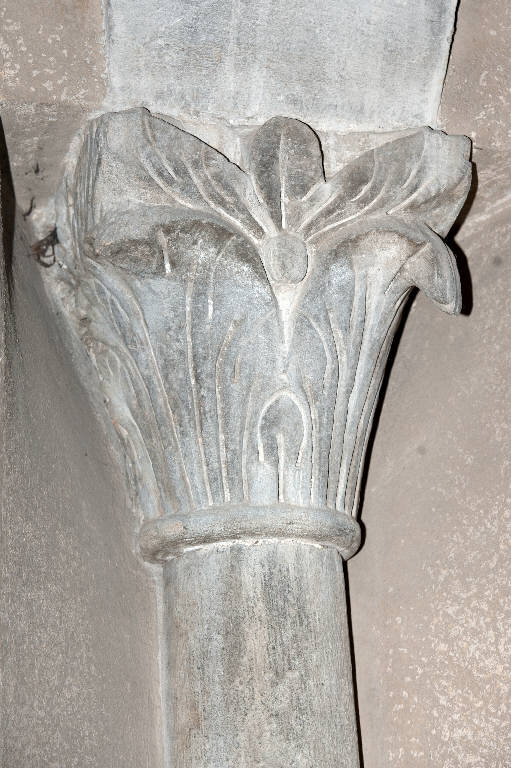 Capitello di colonna in pietra arenaria scolpita; motivi decorativi a foglie d'acanto estroflesse e livello superiore di caulicoli fogliati.