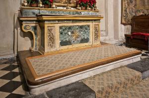 Altare formato da mensa e gradino, composti da specchiature in marmo verde, profilate in marmo rosso modanato; la mensa è ornata da motivi decorativi in metallo dorato.