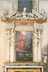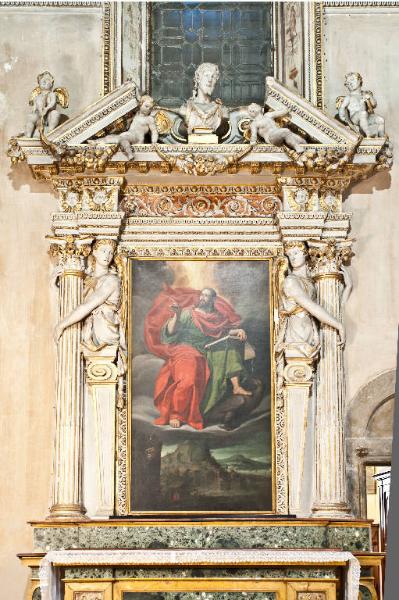 - NOTIZIE STORICO CRITICHE L'ancona fu realizzata dallo stuccatore milanese Francesco Brembilla indicativamente tra il 1578, anno in cui è attestata la sua presenza in basilica, e il 1585, anno in cui i lavori della cappella risultano conclusi e Lorenzo Porta comincia a decorarne le volte a crociera (Cortesi Bosco, in "I pittori bergamaschi...Il Seicento", vol. II, p. 94, nota 6). Al centro è collocata l'opera "San Giovanni Evangelista" (num. foto 763) che Giovan Paolo Cavagna dipinse nel 1589.\nNegli stessi anni il Brembilla realizzò l'ancona della cappella di San Marco nella navatella a destra del presbiterio (num. foto 751).