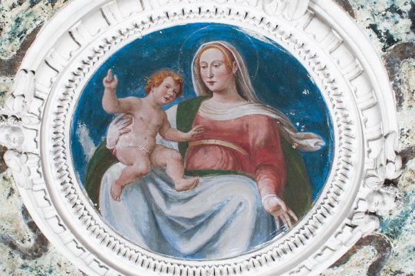 - NOTIZIE STORICO CRITICHE Il tondo con la "Madonna con il Bambino" al centro della volta della sacrestia superiore dipinto da Pietro Baschenis nel 1616 è posto entro una cornice in stucco decorata con testine d'angelo realizzata da Lorenzo Porta nel 1614 (num. foto 1263). Nell'affresco, che risulta pagato nel 1616, è già definita quella tipologia femminile che sarà poi ricorrente nella pittura del Baschenis (Cortesi Bosco, in "I pittori bergamaschi...Il Seicento", vol. II, pp. 92, 106).