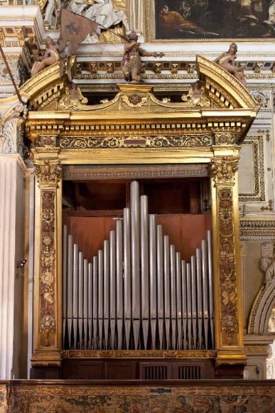 - NOTIZIE STORICO CRITICHE Si ipotizza che le due casse d'organo ubicate sui lati del presbiterio (nn. foto 1015, 1017) siano state realizzate nel corso del Seicento da una bottega locale. All'interno venne ubicato l'organo Vegezzi Bossi costruito nel 1915. Restaurato nel 1948 dalla ditta F.lli Ruffatti, l'organo mantenne inalterate le proprie caratteristiche fancendone uno dei pochi strumenti ad avere ancora l¿impronta e la fonica originale del maestro piemontese.\nLa cassa d'organo in esame, intagliata e scolpita, è costituita da due lesene sormontate da capitello poste a reggere un architrave concluso in alto da due elementi ricurvi di timpano spezzato. Le lesene sono decorate da simboli eucaristici, festoni, testine d'angelo; l'architrave presenta un fregio scolpito a girali, cornice a dentelli, testine d'angelo. In alto, sopra i due elementi di timpano, sono collocati due angioletti seduti mentre al centro si trova la statua di S. Alessandro che regge uno stendardo.\nNon è stato possibile verificare in modo ravvicinato la materia e tecnica delle statue poste sul timpano.