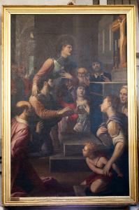 - NOTIZIE STORICO CRITICHE Il dipinto, proveniente dal monastero di Astino e di proprietà del Comune che lo ha depositato presso la basilica (lettera 15 maggio 1882, n. 52, prot. 776/387), è stato riferito dalla tradizione locale al pittore fiorentino Domenico Cresti, detto il Passignano, con ogni probabilità nella sua fase matura ("Inventario beni mobili", 2003). Solo Francesco Maria Tassi ricordava correttamente che nel monastero di Astino "all'altare di S. Giovanni Gualberto vi è uno stupendo quadro di Pietro Sorri discepolo del Cav. Passignano, copioso di molte figure e in ogni sua parte ammirabile". In una biografia manoscritta di Pietro Sorri, rinvenuta da Laura Martini nella Biblioteca Comunale di Siena (cfr. "Itinerario di Pietro Sorri", 1983), risulta che tra le varie opere inviate dal senese Sorri, collaboratore e genero del Passignano, intorno al 1600 in altre città vi era "un S. Giovanni Gualberto [che] mandò a Bergamo". E' probabile che uno degli abati del monastero, molto legato alla casa madre di Vallombrosa, abbia commissionato l'opera a Domenico Passignano, uno dei pittori più vicini all'ordine, e che poi questi abbia fatto eseguire l'opera al genero.\nSecondo la leggenda agiografica Giovanni, figlio di Gualberto, venne chiamato a vendicare la morte del fratello con l'uccisione del rivale. La vendetta si doveva consumare fuori porta San Miniato a Firenze ma il suo avversario si inginocchiò e messe le braccia in forma di croce invocò pietà. Giovanni gettò la spada e concesse il perdono. A quel punto, sempre secondo la tradizione, Giovanni, recatosi nel monastero di San Miniato per pregare, ricevette miracolosamente un segno di approvazione dal crocifisso lì presente. In seguito, ritiratosi all'interno dell'annesso monastero benedettino, diventò monaco e fondo la Congregazione Vallombrosana. Nell'opera in esame il pittore scelse di raffigurare il momento in cui San Giovanni Gualberto, in preghiera davanti al crocifisso insieme all'uccisore del fratello, ne ricevette l'approvazione. La tela è inserita in una semplice cornice lignea dorata.
