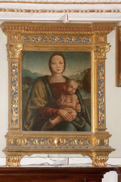 - NOTIZIE STORICO CRITICHE L'oggetto in esame è il prodotto di un artigianato locale di pieno Ottocento che riprende motivi decorativi tipicamente settecenteschi (cornice a dentelli, motivi vegetali a girali e teoria di ovoli). Al centro della cornice è inserita una tavola raffigurante una "Madonna con Bambino" riferibile, con ogni probabilità, ad un ambito lombardo-veneto di fine Quattrocento inizio Cinquecento (num. foto 1090).