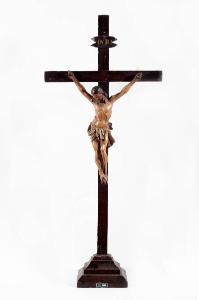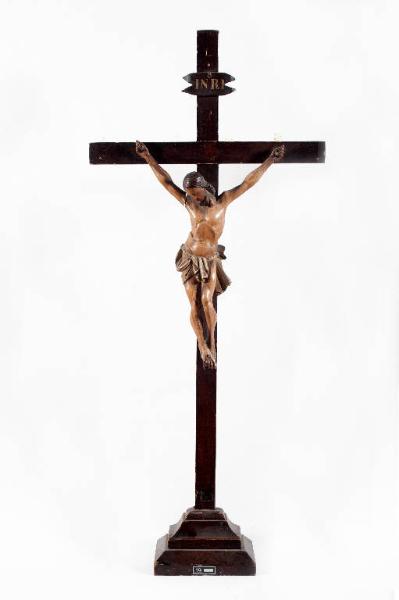 Croce d'altare in legno. Base gradinata; croce liscia; statuetta del Cristo con capo reclinato.