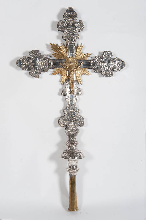 Croce processionale in rame argentato con parti dorate. Innesto a tubo liscio. Nodo strozzato e scanalato. Croce raggiata con motivi vegetali e valve di conchiglia eseguiti a sbalzo nelle terminazioni sagomate. All'incrocio dei bracci è fissata la statuetta del Cristo realizzata a fusione.