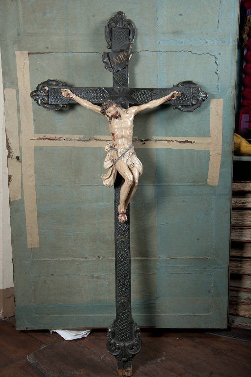 Crocifisso in legno dipinto. La croce decorata con maglia romboidale presenta delle foglie acantiformi arricciate nelle terminazioni. All'incrocio dei bracci è fissata la statua del Cristo con testa inclinata e panneggio molto drappeggiato.