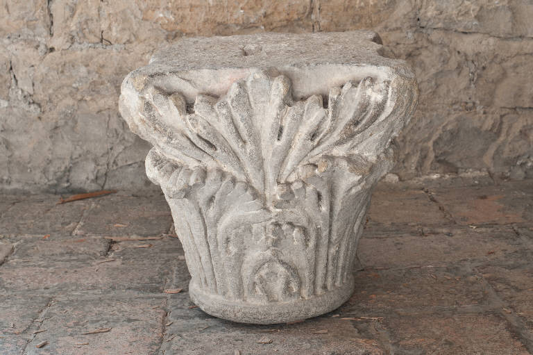 Capitello di colonna in pietra arenaria scolpita; collarino torico; giro di foglie d'acanto, caulicoli fogliati e fogliette trilobe.