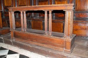 Inginocchiatoio in legno di noce: parapetto a tre aperture, delimitato ai lati da due pilastrini affiancati da colonnine scanalate d'ordine dorico; due coppie delle stesse colonnine dividono le aperture; piano superiore d'appoggio liscio, appena sporgente.