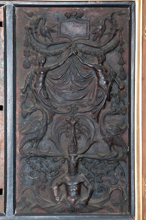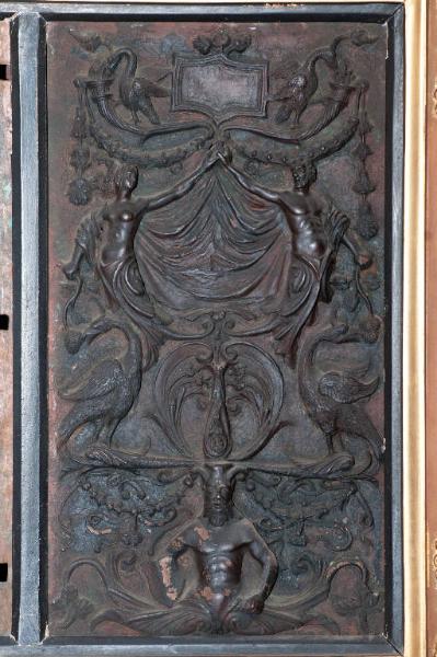 - NOTIZIE STORICO CRITICHE Nel gennaio 1518 il Consiglio della Misericordia di Bergamo deliberava di far eseguire per l'altare maggiore della Basilica di S. Maria un'"anchona pulcherrima" che doveva sostituire una precedente ancona lignea con un'antica statua marmora dellla Vergine e le immagini dipinte degli Evangelisti Giovanni e Marco. Nel 1521 il Consiglio optò per un'ancona in rame dorato con parti in argento secondo un modello scelto tra molti altri, che per magnificenza doveva segnalarsi a livello italiano. Tra gli artisti che si cimentarono in vari progetti figurano anche il padovano Ricco e Lorenzo Lotto. L'incarico dell'ancona e la direzione dei lavori furono affidati al pavese Giovan Simone de Germanis coadiuvato da Giovanni de Cicardis di Piacenza. I lavori iniziarono nel 1522 ma l'impresa dopo poco fallì: nel 1525 gli artefici furono licenziati perché non giudicati all'altezza degli impegni assunti, fors'anche per il loro comportamento disonesto come emerge da una lettera scritta da Lorenzo Lotto che accusa Giova Simone de Germanis di aver tentato di avvelenarlo. Nel 1525 il piacentino Giovanni Cicardi aveva ricevuto dalla MIA "unam lastram rami pro faciendo unam faciem inius pedestalli": si tratta quasi certamente di uno dei setti rilievi in rame con grottesche e motivi all'"antica", che sono attualmente conservati in sacrestia, verosimilmente destinati ai piedistalli delle colonne dell'ancona mai realizzata.