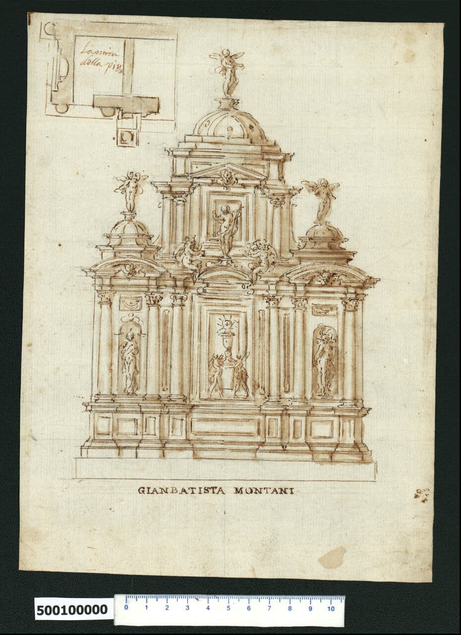 - NOTIZIE STORICO CRITICHE Nell'"Indice de due Tomi d'Intagli Tempietti ed altro", relativo ai tomi V e VI e compilato dal collezionista Giacomo Sardini, il disegno viene iscritto nel paragrafo "Ciborj" con la definizione "1 Molto ornato". \nL'autore del disegno è Giovanni Battista Montano, il cui nome compare alla base del tabernacolo, uno dei tanti da lui disegnati con impostazione simile ma variati nella scelta e composizione degli elementi decorativi. Alcuni sono stati pubblicati da G. B. Soria nell'opera "Tabernacoli diversi, nuovamente inventati da M. Giovanbatista Montano milanese ..." data alle stampe nel 1628, ma non si è ravvisato tra essi un soggetto analogo, salvo l'uso di elementi di repertorio dell'autore.\nL'attribuzione a Montano è indicata anche da V. Pracchi su segnalazione di A. Bedon (Pracchi, 1991 pp. 9, 12) e da L. Fairbairn (Fairbairn, 1998 vol. II, Appendix 8, p. 771).\nIl disegno mostra il prospetto e parte della pianta di un tabernacolo a forma di tempietto, impostato su un basamento. Il corpo principale è composto da semicolonne di ordine corinzio che individuano le campiture laterali, collocate su una zoccolatura articolata e decorata con riquadrature e da colonne libere che inquadrano quella centrale, appoggiate su piedistalli sporgenti.\nNelle campiture laterali sono inserite delle nicchie con statue di Santi sormontate da una riquadratura ornata. Sui capitelli delle semicolonne sono impostati, tramite una trabeazione, frontoni curvilinei spezzati alla base, al centro dei quali è la testa di un cherubino. \nIl volume retrostante le due campiture laterali è coperto da cupolette sagomate a pianta ottagonale sovrastate da una statua di angelo su piedistallo. La campitura centrale, più ampia, ospita all'interno di una riquadratura il calice con l'eucarestia (SS. Sacramento) che si eleva su un piedistallo affiancato da due angeli. Sul frontone curvilineo superiore si erge la statua di Cristo benedicente, presentato da due angeli seduti sulla cornice sporgente della trabeazione sorretta dalle colonne. Sopra questo primo volume si innesta un corpo di dimensioni più piccole anch'esso reso plastico dalla sporgenza delle colonne e relativa trabeazione. La sua conformazione è studiata per fungere da sfondo alla figura di Cristo, che rimane inquadrata tra le colonne e al centro di una doppia riquadratura sormontata da un frontone triangolare spezzato alla base da una testa di cherubino. \nA conclusione della costruzione è un tamburo di raccordo che regge una piccola cupola ottagonale a spicchi, con costoloni e oculi circolari, sulla cui sommità si erge la statua di un angelo simile a quella delle cupolette laterali.\nIl disegno può essere confrontato, per alcuni dettagli comuni, con altri della presente collezione (Milano, Collezione Sardini Martinelli invv. 5,7; 5,49; 6,35; 6,40; 6,41; 6,75; 6,138-139 R) e in particolare con l'inv. 4,51, in cui compaiono la stessa firma e la pianta parziale con analoga iscrizione di un tabernacolo impostato su basamento articolato con riquadrature e con elementi simili, quali la cupoletta superiore costolonata con oculi, la figura di Cristo indicata da angeli, il calice con l'ostia entro la riquadratura centrale e nicchie laterali con statue.\nIl disegno trova riscontri con altri fogli conservati in collezioni estere, tra cui un disegno di tabernacolo attribuito a Montano, di struttura più semplice, appartenente all'Album di Antonio Garcia Reinoso conservato presso la Biblioteca Nazionale di Madrid (cfr. D. R. Ruiz, Album di Antonio Garcia Reinoso inv. AB 909, n. 75 p. 99).\nUlteriori disegni di tabernacoli, non visionati, sono presenti nelle collezioni di Edimburgo, Parigi e Madrid segnalati con le relative collocazioni da L. Fairbairn nel volume dedicato ai disegni del Rinascimento Italiano (Fairbairn, ibidem, p. 771).