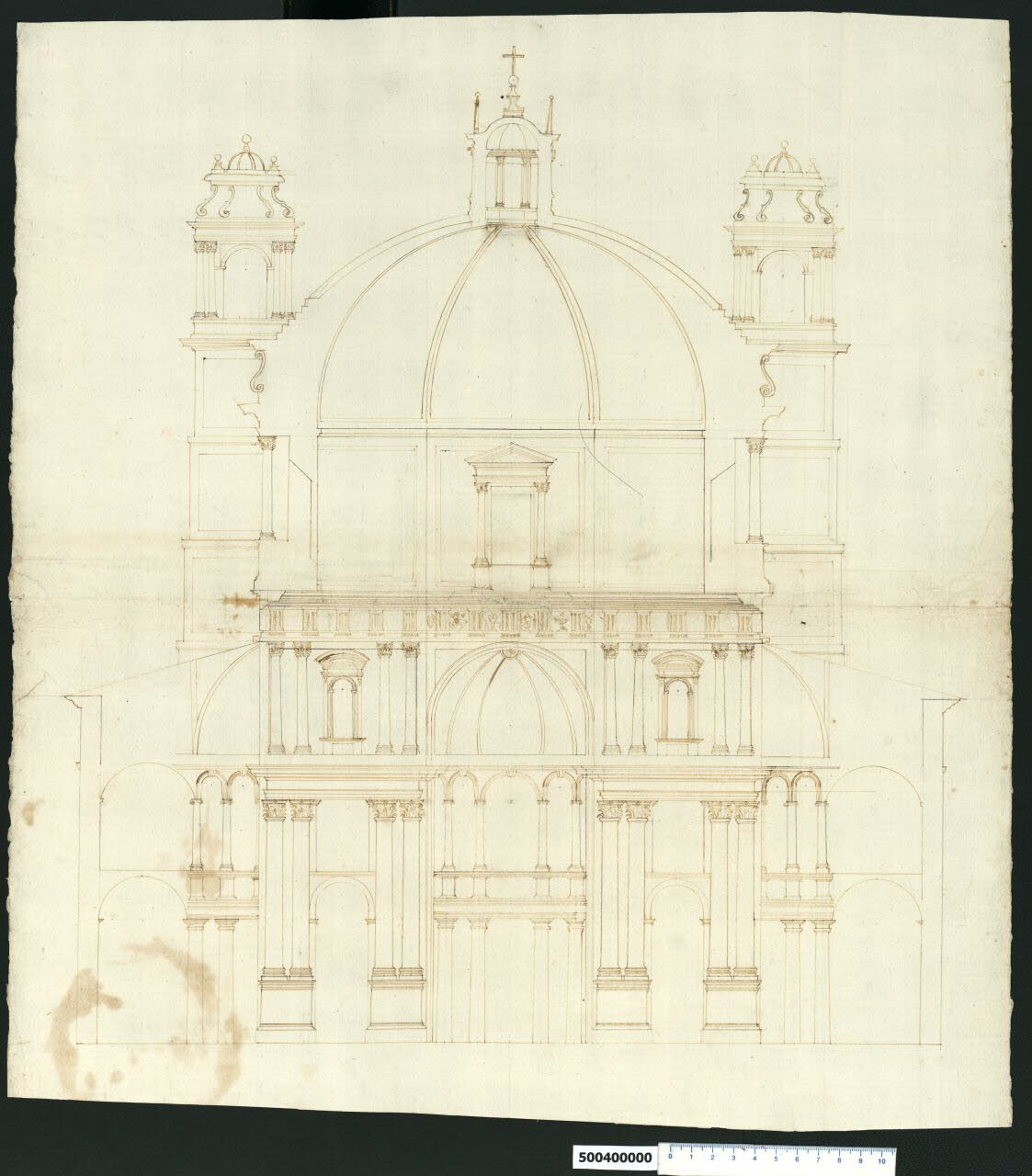 - NOTIZIE STORICO CRITICHE Nell'"Indice de due Tomi d'Intagli Tempietti ed altro", relativo ai tomi V e VI e compilato dal collezionista Giacomo Sardini, il disegno viene iscritto nel paragrafo "Chiese e loro parti" con la definizione "4 Spaccato di Chiesa".\nIl disegno appartiene alla serie di proposte per il rifacimento della cupola della chiesa di S. Lorenzo a Milano, crollata con parte della basilica il 10 giugno 1573. S. Carlo Borromeo incaricò forse inizialmente Pellegrino Pellegrini (Tibaldi), ma il primo ufficiale responsabile della ricostruzione è Martino Bassi, che ha lasciato una notevole quantità di disegni di messa a punto del progetto, approvato dal Borromeo nel 1577, conservati presso la Biblioteca Ambrosiana di Milano (BAM, Raccolta Bernardino Ferrari, t. XI, parte II, s. 150 sup.). Il progetto del Bassi nel 1589 fu posto infatti in discussione dal punto di vista formale e statico-costruttivo dal milanese Guido Mazenta, fratello di Alessandro, canonico del duomo e poi "praefectus fabricae" di Federico Borromeo e di Giovanni Ambrogio, barnabita e architetto. Il Mazenta chiese pareri a più architetti operanti a Firenze e a Roma e si istituì una commissione di tre architetti esperti: Ambrogio Alciati, Vincenzo Seregni e forse Tolomeo Rinaldi, contrario all'opera del Bassi (gli scritti allora prodotti furono pubblicati nel 1771 da B. Ferrari, con la verifica dei calcoli strutturali del Bassi, e riediti da C. Baroni nel 1940). Le diverse soluzioni del Bassi e di altri architetti, prodotte in corso d'opera, anche dopo la morte del Bassi (1591) fino al completamento della cupola nel 1619 da parte di Aurelio Trezzi, sono in parte conservati alla Biblioteca Ambrosiana al cod. F 251 inf. (raccolta di F. M. Richino), all'Archivio Storico Civico di Milano (Milano, Biblioteca Trivulziana, Raccolta Bianconi, IV, pp. 19-28) e in parte sparsi in diverse collezioni in Italia (Firenze, Uffizi A 190; ASD, Archivio Spirituale sez. X vol V) e all'estero (Londra, Victoria & Albert Museum , nn. 613-614). \nA questa serie appartengono forse anche questa sezione del corpo centrale della chiesa con due delle quattro torri e il disegno di inv. 5,32 bis, con il nucleo centrale in sezione e prospetto e l'avancorpo della basilica. I due disegni sembrano opera dello stesso autore. \nNel disegno la parte sottostante l'imposta della cupola, appiattita nella vista frontale, si propone in realtà di costituire un ottagono regolare fin dalla base, irrobustendo i pilastri di raccordo tra i conchi con un ordine di coppie di colonne o paraste di ordine corinzio gigante, su cui è impostata la trabeazione che porta al secondo livello con coppie di supporti corinzi più piccoli che inquadrano nicchie incorniciate a livello dei catini. Sulla trabeazione soprastante, ornata da triglifi alternati a decori con soggetto liturgico, è impostato un tamburo ottagonale con quattro finestre a edicola e una cupola a tutto sesto. All'esterno il tamburo è ornato da coppie di colonne corinzie a reggere una cupola ottagonale a spicchi, il cui profilo è mitigato alla base da un cornicione con volute negli spigoli e una serie di gradoni, come meglio si evince dal prospetto esterno del disegno di cui all'inv. 5,32 bis. Nella sezione compare anche il profilo dei conchi e del deambulatorio su due piani; sullo sfondo si intravedono le due torri rielaborate con un disegno in stile con la chiesa, che prevede una serie di campiture cieche quadrate e rastremate fino all'imposta della gradonatura esterna della cupola, su cui si erge la parte terminale, con aperture a tutto sesto fiancheggiate da piccole semicolonne binate, sovrastate da un cornicione con volute che riprende quello della cupola, da una piccola cupoletta a spicchi e da pennacchi. Anche il lanternino sopra la cupola riprende i motivi compositivi già citati.\nIl tentativo di attribuzione è complesso. C. Baroni che per primo ha pubblicato i disegni (Baroni, 1941 pp.61-62), non ritiene il disegno opera di Giovanni Battista Montano, attribuendolo con formula dubitativa al Rinaldi.\nIl profilo della cupola, che richiama il Pantheon e per alcuni elementi S. Pietro in Vaticano, indurrebbe ad assegnare il disegno a un autore operante in ambito romano, come conferma A.Scotti, pubblicando nel 2004 i disegni di S. Lorenzo presenti in questo tomo, pur dubitando dell'esecuzione di Montano (Scotti, 2004 pp.177-179).\nLa grafia è incerta e i disegni rivelano incongruenze strutturali e di rappresentazione, sottolineate anche da G. Rocchi Coopmans de Yoldi, che pubblica i disegni in una rassegna dell'iconografia di S. Lorenzo prima della ricostruzione cinquecentesca (Gatti Perer, 1991 pp. 98-99), istituendo confronti e ipotizzando sequenze, senza fornire però ipotesi di attribuzione. Il disegno riporta varie cancellature e correzioni, che confermerebbero la fase di studio seppur avanzato del disegno, eseguito in relazione al progetto di M. Bassi del 1577, che ha un avancorpo con fronte simile a quello del disegno di inv. 5,32 bis.