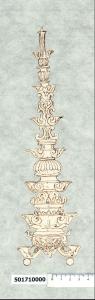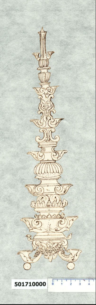 - NOTIZIE STORICO CRITICHE Nell'"Indice de due Tomi d'Intagli Tempietti ed altro", relativo ai tomi V e VI e compilato dal collezionista Giacomo Sardini, il disegno viene iscritto, insieme ad altri, nel paragrafo "Candelieri" con la definizione "18. 17. Candelabri diversi". Il foglio è attribuito a Giovanni Battista Montano da Valeria Pracchi (1991, 2a parte) su segnalazione di Anna Bedon, però il confronto con altri elaborati di sicura paternità montaniana porta ad escludere tale attribuzione. In questo disegno la resa grafica è incerta e poco espressiva, più vicina alle capacità tecniche di un allievo. Il disegno raffigura un candeliere retto da due sfere sulle quali sono appoggiate le padelline, destinate ad ospitare il cero, avvolte da foglie d'acanto e raccordate al centro da una testa di cherubino alata e ghirlande. Il motivo delle padelline viene ripetuto cinque volte dal basso verso l'alto, alternato a nodi formati da corone vegetali, volute contrapposte e specchietto con testa di cherubino. Il disegno, che è ritagliato, fa parte di una serie di quattro candelieri, del tutto simili a parte piccole varianti grafiche (Milano, Collezione Sardini Martinelli inv. 17,2; 19,1; 19,2).