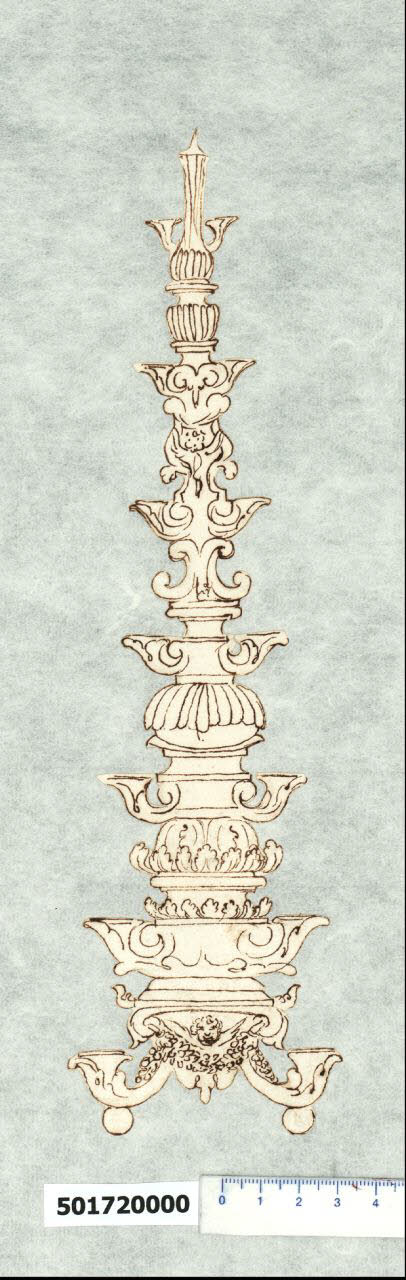 - NOTIZIE STORICO CRITICHE Nell'"Indice de due Tomi d'Intagli Tempietti ed altro", relativo ai tomi V e VI e compilato dal collezionista Giacomo Sardini, il disegno viene iscritto, insieme ad altri, nel paragrafo "Candelieri" con la definizione "18. 17. Candelabri diversi". Il foglio è attribuito a Giovanni Battista Montano da Valeria Pracchi (1991, 2a parte) su segnalazione di Anna Bedon, però il confronto con altri elaborati di sicura paternità montaniana porta ad escludere tale attribuzione. In questo disegno la resa grafica è incerta e poco espressiva, più vicina alle capacità tecniche di un allievo. Il disegno raffigura un candeliere retto da due sfere sulle quali sono appoggiate le padelline, destinate ad ospitare il cero, avvolte da foglie d'acanto e raccordate al centro da una testa di cherubino alata e ghirlande. Il motivo delle padelline viene ripetuto cinque volte dal basso verso l'alto, alternato a nodi formati da corone vegetali, volute contrapposte e specchietto con testa di cherubino. Il disegno, che è ritagliato, fa parte di una serie di quattro candelieri, del tutto simili a parte piccole varianti grafiche (Milano, Collezione Sardini Martinelli inv. 17,1; 19,1; 19.2).