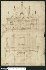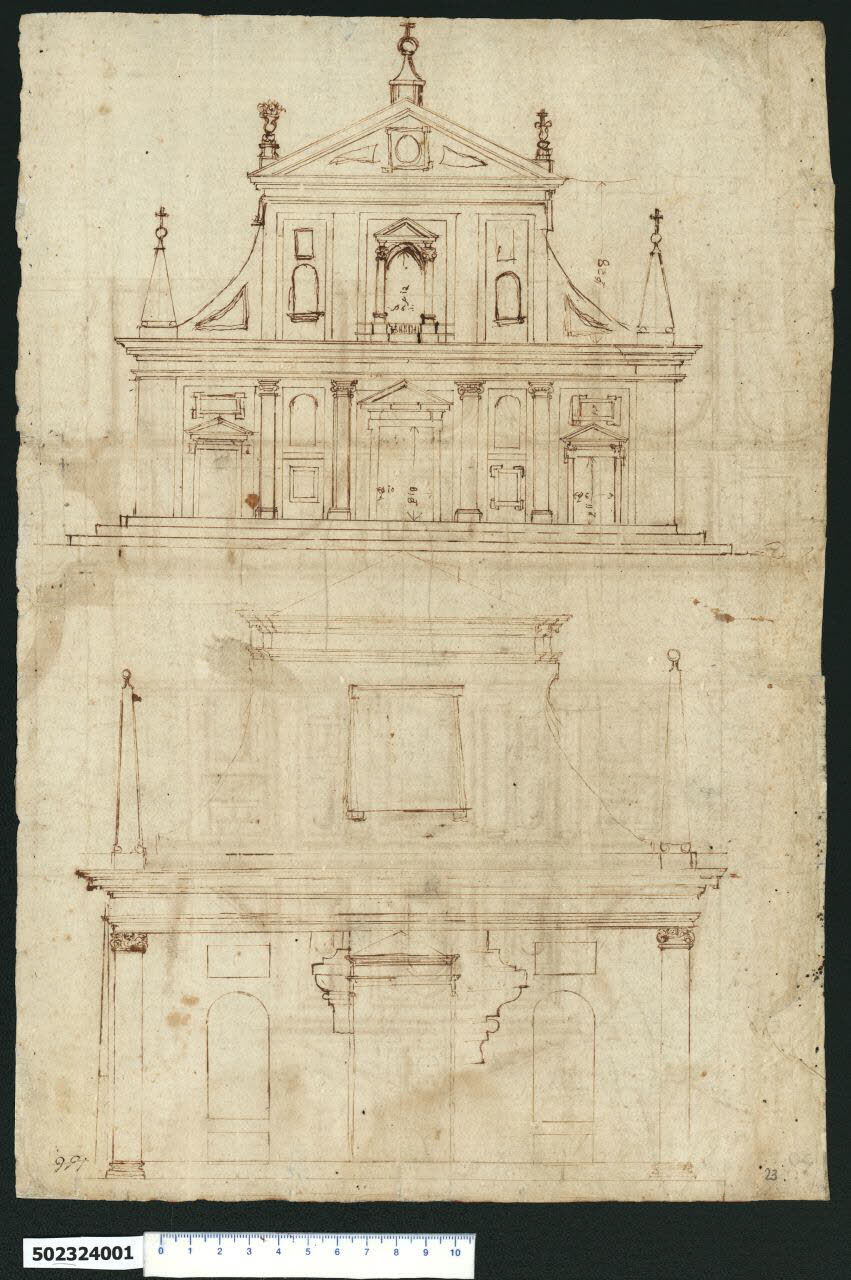- NOTIZIE STORICO CRITICHE Nell'"Indice de due Tomi d'Intagli Tempietti ed altro", relativo ai tomi V e VI e compilato dal collezionista Giacomo Sardini, il disegno viene iscritto nel paragrafo "Chiese e loro parti" con la definizione "156 altra d.a" [si legga: facciata]. Il foglio è stato inserito, all'epoca di Sardini, in sostituzione di due disegni registrati nell'Indice al paragrafo "Armaj" con definizione "22 con reliquie" e al paragrafo "Banchi" con definizione "23 con intagli".\nSu recto del foglio in esame sono tracciati due disegni che costituiscono lo studio, attribuito a Giovanni Battista Montano da Lynda Fairbairn (Fairbairn, 1998 vol. II, Appendix 8, p. 770), della facciata di una chiesa di cui non è stato possibile identificare la localizzazione, definita e rilevata con le ombreggiature sul verso del foglio (Milano, Collezione Sardini Martinelli Inv. 5,23-24 V). \nNella parte bassa si trova il disegno di una facciata a due piani appena abbozzata e con alcuni schizzi di dettaglio a lato dell'ingresso, relativi alle modanature delle cornici.\nAl piano inferiore la fronte è racchiusa tra due colonne o semicolonne con capitelli a volute ioniche inframmezzate da testine di cherubini ed è scandita da un portone centrale con frontone triangolare superiore e due nicchie laterali semicircolari, poste tra semplici riquadrature allineate in alto e in basso.\nSopra la robusta trabeazione con cornicione aggettante, si staglia il blocco superiore centrale forato da una larga apertura leggermente trapezoidale e concluso da un frontone triangolare, raccordato con due quinte triangolari arrotondate a due alti obelischi in pietra posti ai margini del cornicione, che ricordano quelli della chiesa di S. Maria dell'Orto a Roma, la cui facciata attribuita a Francesco da Volterra fu completata dal Vignola nel 1567. \nIl disegno soprastante riporta una facciata più definita e quotata, anche se la grafia risulta incerta, di una chiesa di dimensioni maggiori e con una composizione più articolata, ma molto più tozza della precedente. La chiesa si erge su una base a tre gradini ed è ripartita al piano inferiore in cinque campiture comprese tra due massicce lesene angolari e suddivise da semicolonne ioniche. Nella campitura centrale si trova l'ingresso principale più alto sormontato da un frontone triangolare e in quelle estreme si trovano gli ingressi con la stessa fattura ma di dimensioni ridotte e sormontati da una riquadratura incorniciata e sagomata. Tra le campiture mediane si trovano nicchie semicircolari con riquadratura sottostante incorniciata (e sagomata a destra). Sull'imponente cornicione sporgente è impostata la parte superiore della facciata che corrisponde alle tre campate centrali, qui individuate da doppie riquadrature che incorniciano ai lati nicchie semicircolari con riquadratura soprastante e al centro una apertura a edicola con balaustrino e frontone triangolare sorretto da semicolonne. Un ampio frontone triangolare con elemento decorativo centrale e pennacchi con vasi e croci ai vertici, conclude il secondo livello della facciata, raccordato ai due elementi conici sormontati da sfera con croce corrispondenti alle lesene angolari sottostanti, da due quinte triangolari arrotondate e riquadrate al centro. \nL'impianto della facciata fu definito con la Controriforma e radicalizzato durante il pontificato di Gregorio XIII con il completamento nel 1577 della Chiesa del Gesù, già progettata da Vignola tra il 1568-70, da parte di Giacomo della Porta con una struttura più massiccia. \nOltre al già citato paragone con la chiesa di S. Maria dell'Orto e per l'apertura centrale al secondo livello e il timpano superiore, alla Chiesa del Gesù, la chiesa denota soprattutto riferimenti con le chiese di Martino Longhi il Vecchio (1534-1591), con cui Montano collaborò, tra cui quella romana di S. Girolamo degli Schiavoni e la chiesa di S. Croce a Bosco Marengo (AL). Occorre rilevare tuttavia che generalmente tutte le chiese avevano un doppio ordine di lesene con capitello, mentre in questo caso al livello superiore sono campiture riquadrate abbastanza singolari, che si ritrovano al piano superiore del cortile di palazzo Altemps, realizzato sempre da Martino Longhi.