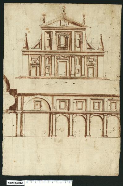 - NOTIZIE STORICO CRITICHE Nell'"Indice de due Tomi d'Intagli Tempietti ed altro", relativo ai tomi V e VI e compilato dal collezionista Giacomo Sardini, il disegno viene iscritto nel paragrafo "Chiese e loro parti" con la definizione "156 altra d.a" [si legga: facciata]. Il foglio è stato inserito, all'epoca di Sardini, in sostituzione di due disegni registrati nell'Indice al paragrafo "Armaj" con definizione "22 con reliquie" e al paragrafo "Banchi" con definizione "23 con intagli".\nSul lato in esame del foglio, nella parte superiore, compare la facciata della chiesa abbozzata sul recto, qui definita e rilevata con le ombreggiature, insieme a un tratto della zona absidale in pianta e una sezione longitudinale tracciata nella parte inferiore del supporto. E' possibile quindi apprezzare il gioco chiaroscurale creato dalle rientranze murarie e dalle aperture, difficilmente individuabili nel disegno precedente. Non vi sono variazioni di rilievo rispetto all'impostazione primitiva e anche questo disegno è quotato e realizzato in scala.\nPer la descrizione e le considerazioni sulla facciata si rimanda quindi all'inv. 5,23-24 R (Milano, Collezione Sardini Martinelli).\nLa piccola porzione di pianta tagliata dal limite del margine sinistro, rivela un'abside semicircolare all'interno come all'esterno, fiancheggiata da absidiole laterali semicircolari riquadrate all'esterno.\nIl prospetto interno longitudinale è ritmato dalla successione di arcate a pieno centro, poggianti su pilastri cruciformi con capitelli dorici, cui corrispondono, divise da una marcata cornice aggettante, riquadrature rientranti di forma quadrata con al centro aperture rettangolari contornate da cornici sagomate. La sequenza, di cui non si conosce il limite perché interrotta dal margine destro del foglio, è seguita da un ampio arco a doppia altezza interrotto dalla cornice e con al centro della lunetta così determinata, una finestra analoga e in linea con le precedenti. Un sostegno più marcato costituisce probabilmente l'imposta di un'arcata trasversale.\nNon è stato possibile attribuire con certezza il disegno, tuttavia le caratteristiche architettoniche rievocano le chiese realizzate da Martino Longhi il Vecchio.