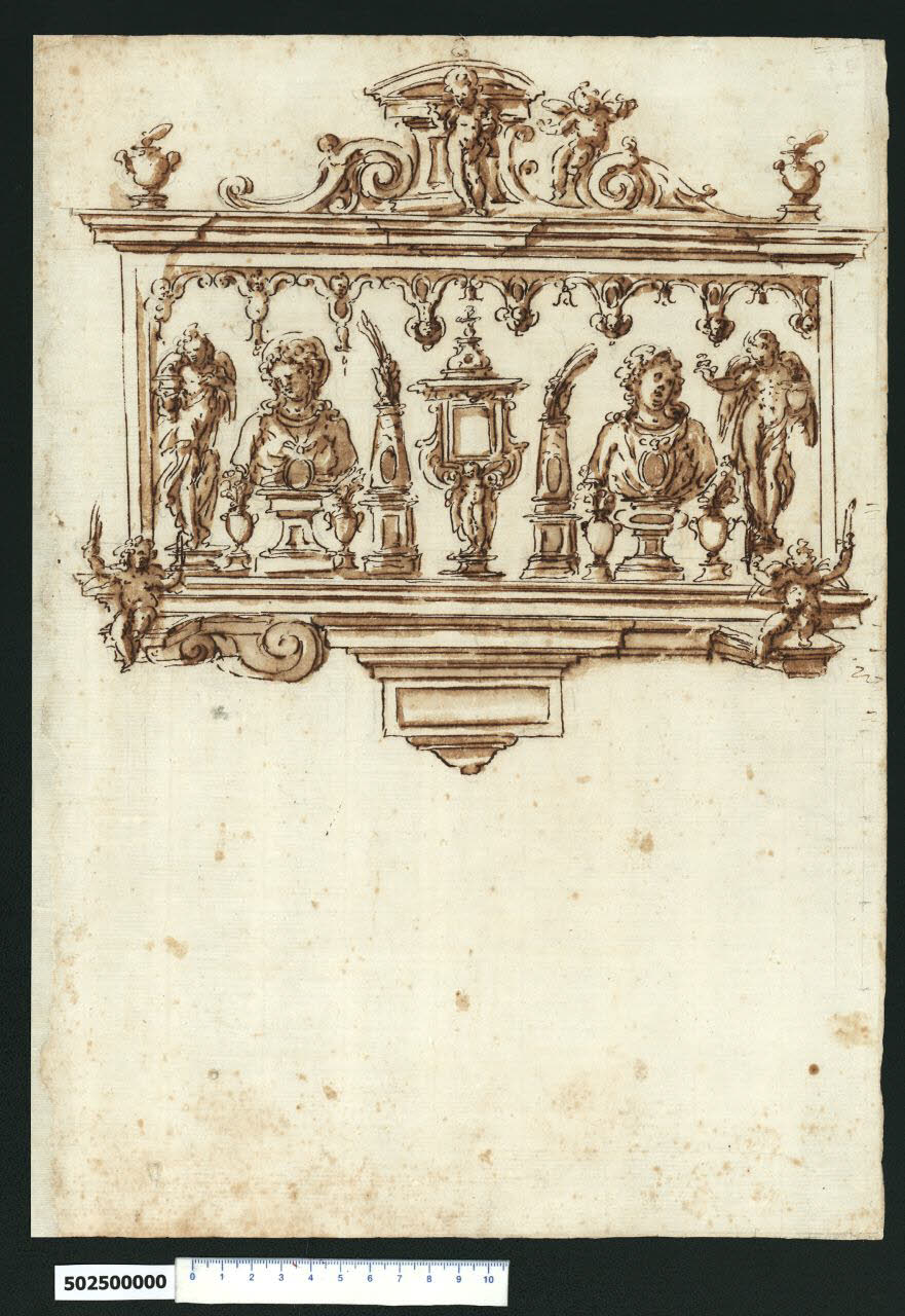 - NOTIZIE STORICO CRITICHE Nell'"Indice de due Tomi d'Intagli Tempietti ed altro", relativo ai tomi V e VI e compilato dal collezionista Giacomo Sardini, il disegno viene iscritto nel paragrafo "Armaj" con la definizione "24 con Reliquie".\nIl disegno, la cui attribuzione a Giovanni Battista Montano è indicata da V. Pracchi su segnalazione di A. Bedon (Pracchi, 1991 p. 14) e da L. Fairbairn (Fairbairn, 1998 vol. II, Appendix 8, p. 771), raffigura una teca per reliquie in due versioni rispetto alla mezzeria. \nIl Medioevo rappresenta certamente uno dei periodi di maggiore diffusione del culto delle reliquie, il cui termine deriva dal latino reliquiae ossia resti. Risale infatti a quest'epoca la fondazione di importanti santuari, ove conservarle e renderle visibili ai fedeli, rendendo questi luoghi importanti mete di pellegrinaggio. Alla reliquia è attribuito un valore devozionale e salvifico, essendo un'efficace intercessione verso la figura santa cui è connessa. Per custodire i resti e renderne possibile l'ostensione, furono creati nel tempo svariati tipi di contenitori, realizzati con materiali che variano dall'oro e dall'argento (arricchiti con smalti e gemme) all'avorio, al legno, spesso rivestito da lamina metallica più o meno pregiata, al vetro e alla cartapesta.\nFin dall'XI secolo è andata diffondendosi la consuetudine di realizzare i cosiddetti 'reliquiari parlanti', ossia contenitori che dichiarano attraverso la forma esteriore la natura della reliquia. È il caso dei reliquiari antropomorfi, che raffigurano in forma scultorea varie parti del corpo umano, quali mani, braccia, gamba o piede oppure la testa o il busto del santo. A partire dal XVI secolo il reliquiario ha conosciuto un notevole incremento produttivo dovuto anche alla scoperta delle catacombe romane con relativi resti ritenuti appartenenti a martiri cristiani. Di conseguenza con il moltiplicarsi delle reliquie numerosissime chiese si sono dotate di uno straordinario numero di reliquiari, realizzati nelle forme e in materiali estremamente diversificati talvolta mutuati dalle tipologie più antiche. Molto frequenti furono quelli monumentali, in legno intagliato e dorato.\nIn questo reliquiario a teca, il riquadro centrale rettangolare, ornato superiormente da un decoro a pendenti con testine di cherubini differentemente disposte rispetto alla mezzeria, contiene al centro un reliquiario a ostensorio, affiancato da due reliquiari a braccio con palma nella mano, due reliquiari a busto con urne fiammeggianti a lato e due reliquiari a statua in forma di angeli verso i bordi esterni. Il riquadro, appeso al muro, è sostenuto a sinistra da una voluta che si ripropone verso l'esterno per reggere la cornice su cui siede la figura di un angioletto con in mano una palma e una spada o candela, a destra lo stesso angioletto è semplicemente appoggiato sulla cornice che rigira sporgendo in avanti. Al centro pende un riquadro che probabilmente doveva contenere un'iscrizione. Nella parte superiore il riquadro è concluso da un'altra cornice sagomata che regge ai lati due urne fiammeggianti mentre al centro si sviluppa un motivo decorativo con un putto appoggiato a un riquadro sormontato da frontone curvilineo, retto a sinistra e a destra da due diversi motivi vegetali a voluta, di cui quello destro reggente la figura di un putto alato. \nAltri reliquiari sono inseriti nella presente collezione (Milano, Collezione Sardini Martinelli, invv. 2,26 e 5,27).
