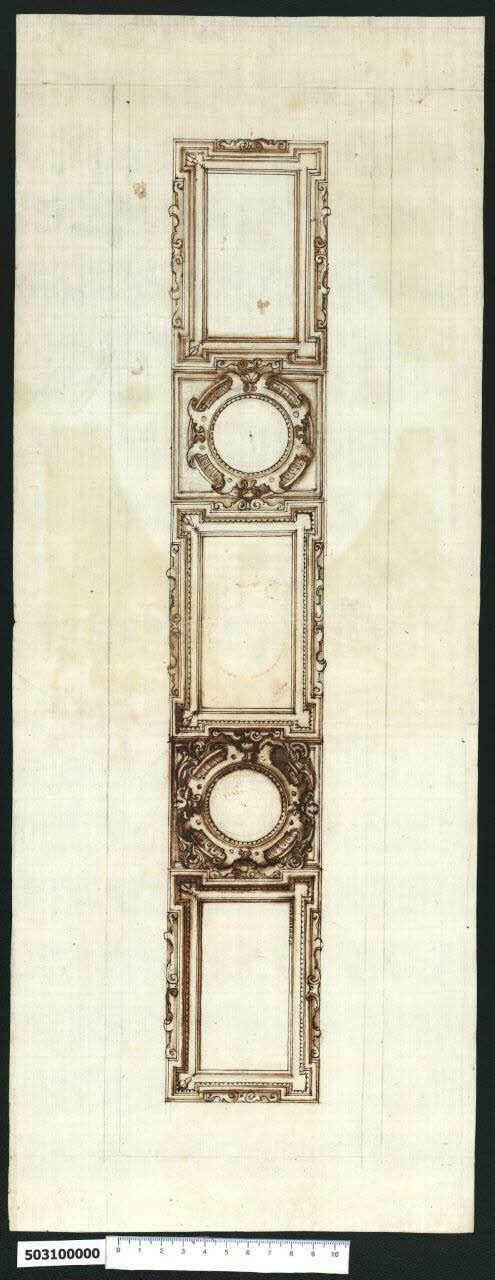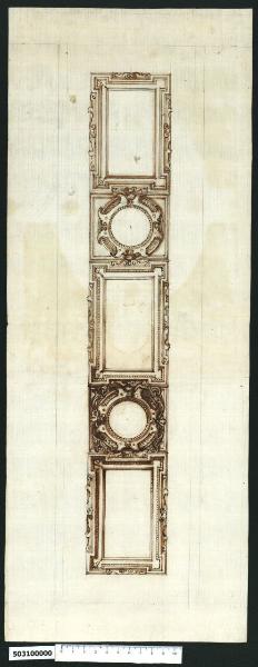 - NOTIZIE STORICO CRITICHE Nell'"Indice de due Tomi d'Intagli Tempietti ed altro", relativo ai tomi V e VI e compilato dal collezionista Giacomo Sardini, il disegno viene iscritto, insieme ad altri in parte non contigui, nel paragrafo "Ornati" con la definizione "182 59 62 28 Fregio". Il disegno che non è stato possibile identificare, raffigura un fregio con elementi rettangolari alternati a tondi, che potrebbe essere destinato sia a un soffitto, sia a una parete. Le cornici rettangolari mostrano gli angoli con alette sporgenti internamente decorate con i monti chigiani. I tondi presentano invece un alto bordo con scanalature interne, sormontato da una cornice mistilinea. La parte inferiore del disegno è maggiormente definita dal punto di vista grafico con l'aggiunta di ombre e ulteriori dettagli decorativi.