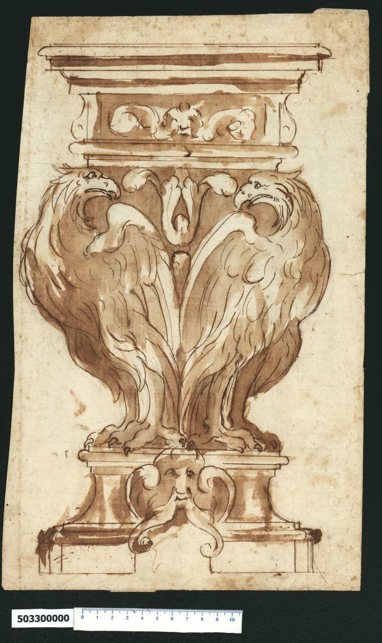 - NOTIZIE STORICO CRITICHE Nell'"Indice de due Tomi d'Intagli Tempietti ed altro", relativo ai tomi V e VI e compilato dal collezionista Giacomo Sardini, il disegno viene iscritto nel paragrafo "Vasi" con la definizione "31 con aquile".\nL'oggetto qui rappresentato, è segnalato da V. Pracchi, come vaso ed è da lei attribuito, su segnalazione di A. Bedon (Pracchi, 1991 p. 14), a Giovanni Battista Montano, indicato come autore anche da L. Fairbairn (Fairbairn, 1998 vol. II, Appendix 8, p. 771). \nNon trova la stessa corrispondenza in A. Gonzales Palacios, che lo associa ai mobili romani barocchi (Gonzalez Palacios, 2004 p. 122).\nL'oggetto, rappresentato in prospetto, non sembra avere la base e l'imboccatura arrotondata tipica di un vaso e pertanto si propende a identificarlo genericamente come piedistallo figurato, con una foggia originale fornita dagli elementi che lo compongono. Sopra una base sagomata al cui centro è posto un mascherone di vecchio con barba e baffi arricciati in volute, sono appollaiati due rapaci che si rivolgono il dorso ma si fronteggiano col capo girato verso l'interno e che probabilmente sono riproposti sul lato retrostante, in modo da costituire i quattro appoggi per il ripiano superiore. Tra i rapaci è un decoro con motivo vegetale a foglie contrapposte che formano una sorta di calice, mentre la riquadratura soprastante riporta la testa di un cherubino appena abbozzata.\nDa segnalare un vaso decorato con aquile presente all'interno del tomo VI della presente collezione (Milano, Collezione Sardini Martinelli inv. 6,114), probabilmente dello stesso autore.\nI motivi figurativi utilizzati sono sicuramente simbolici e inducono ad associare l'oggetto raffigurato alla famiglia Borghese, per le aquile presenti nello stemma gentilizio. Un'aquila simile si trova sopra un piedistallo all'entrata alla villa Borghese dalla porta Pinciana, ma questo simbolo è raffigurato in molte opere realizzate da papa Paolo V e dai suoi successori, soprattutto il cardinale Scipione Borghese. Mentre per Paolo V lavorò Giovanni Battista Montano, per il nipote Cardinale uno degli architetti favoriti fu Giovanni Battista Soria, allievo di Montano.
