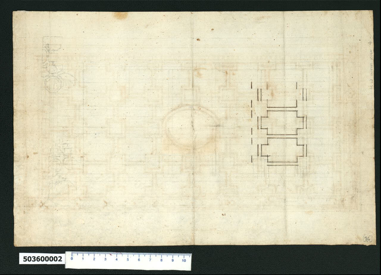 - NOTIZIE STORICO CRITICHE Il disegno, verso di quello precedente (Milano, Collezione Sardini Martinelli inv. 5,36 recto) mostra alcuni schizzi a matita per cassettoni esagonali e a china per cassettoni a croce con braccio trasversale allungato, probabili soluzioni alternative a quella raffigurata sul recto.