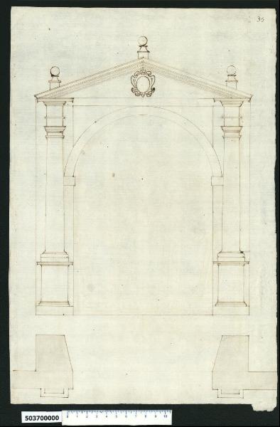 - NOTIZIE STORICO CRITICHE Nell'"Indice de due Tomi d'Intagli Tempietti ed altro", relativo ai tomi V e VI e compilato dal collezionista Giacomo Sardini, il disegno viene iscritto nel paragrafo "Portoni" con la definizione "35 Toscano".\nIl disegno raffigura un portale di accesso rappresentato in pianta e prospetto. Il passaggio ad arco a tutto sesto è inquadrato da due lesene di ordine toscano poste su piedistalli e sormontate da doppio piedritto che sorregge il frontone triangolare conclusivo. Sopra quest'ultimo sono posti, al culmine e ai lati in corrispondenza dei sostegni, degli elementi decorativi in pietra sagomati sormontati da una sfera, mentre nel suo centro, in corrispondenza del culmine dell'arco, si trova un cartiglio per stemma gentilizio. La pianta evidenzia lo spessore del muro e la strombatura dell'ingresso verso l'interno. Non sono presenti elementi sufficienti per identificare l'autore.