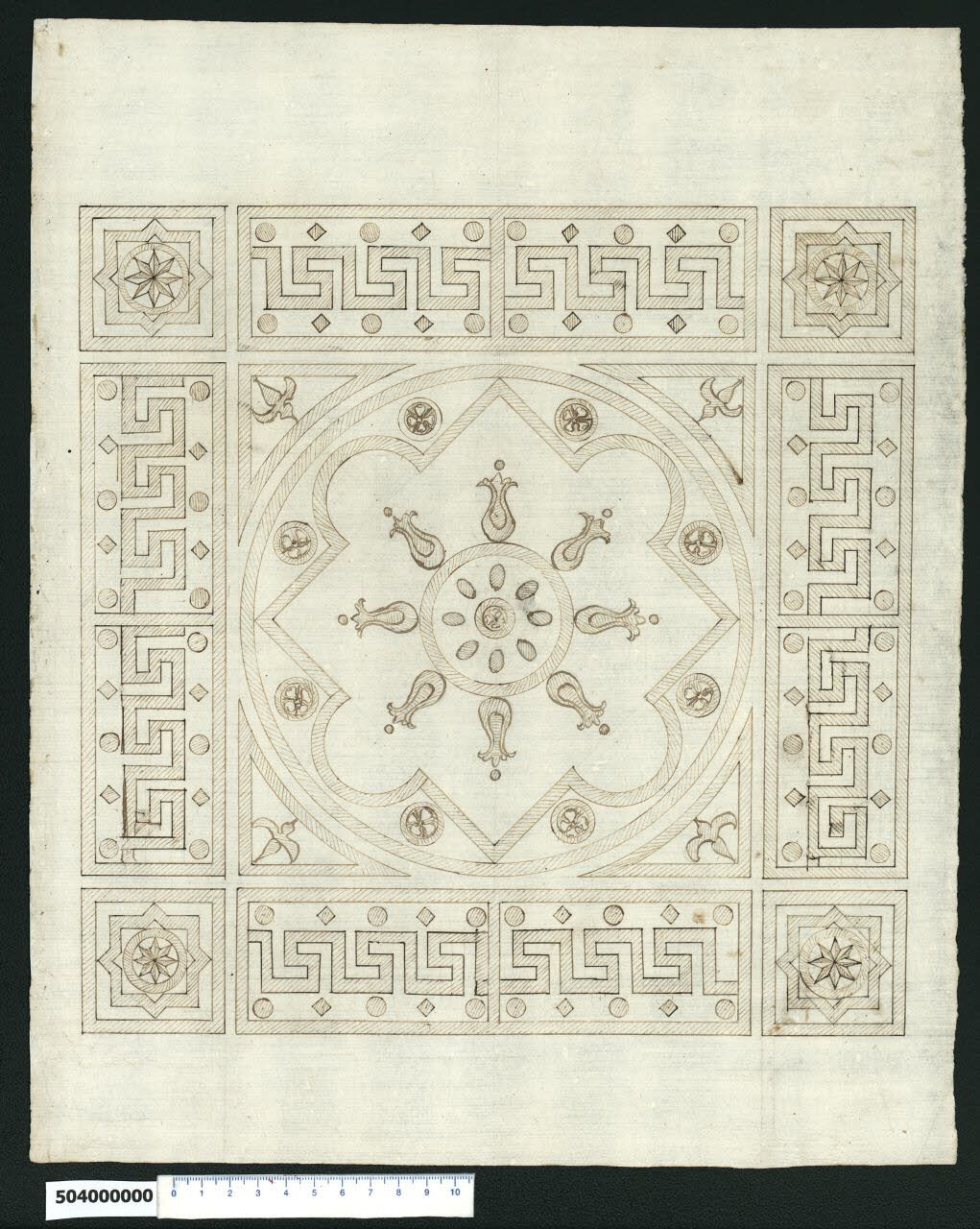 - NOTIZIE STORICO CRITICHE Nell'"Indice de due Tomi d'Intagli Tempietti ed altro", relativo ai tomi V e VI e compilato dal collezionista Giacomo Sardini, il disegno viene iscritto nel paragrafo "Chiese e loro parti" con la definizione "38 Pavimento". Il disegno, che non è stato possibile identificare, raffigura un progetto decorativo per un pavimento. Il perimetro del quadrato di base è definito da una fascia a meandro, e con stelle racchiuse entro quadrati intersecati poste in corrispondenza degli angoli. All'interno è disegnato un cerchio che a sua volta racchiude un quadrato con i lati lobati, entro il quale è disegnato un cerchio più piccolo ornato da gigli.