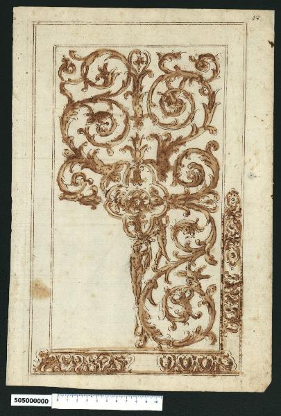 - NOTIZIE STORICO CRITICHE Il disegno è escluso dall'indice di Giacomo Sardini. Sul foglio in esame è raffigurato un disegno di un pannello decorativo non attribuibile a un oggetto specifico, realizzato da Giovanni Battista Montano, come riferiscono anche V. Pracchi su segnalazione di A. Bedon (Pracchi, 1991 p. 14) e L. Fairbairn (Fairbairn, 1998 vol. II, Appendix 8, p. 771).\n Il decoro, tracciato all'interno di una campitura e contornato da una cornice anch'essa ornata, è parziale e asimmetrico, in quanto si tratta sicuramente di diverse prove compositive del motivo su un unico foglio. Il motivo si sviluppa da un nucleo centrale costituito da un fiore inscritto in un cerchio contornato da quattro calici ai vertici interni di un decoro quadrilobato. Da essi si sviluppano girali di motivi vegetali da cui fuoriescono putti alati o inframmezzati da figure appoggiate o appese. Nella cornice sono proposti quattro motivi decorativi diversi sia di tipo vegetale, sia con testine incorniciate. \nUn disegno di pannello molto simile, anche se più complesso negli intrecci decorativi, si trova nella Collezione conservata al Sir John Soane's Museum, catalogato da Lynda Fairbairn (Fairbairn,1998 vol. II p. 621 n. 1017). Nella stessa raccolta un altro decoro con girali al n. 1008-9 p. 619. Sul verso del foglio sono presenti disegni a grafite non identificati.