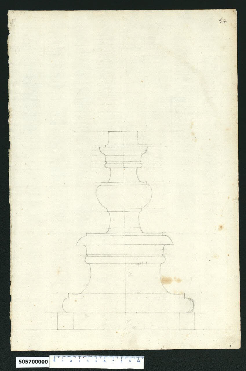 - NOTIZIE STORICO CRITICHE Nell'"Indice de due Tomi d'Intagli Tempietti ed altro", relativo ai tomi V e VI e compilato dal collezionista Giacomo Sardini, il disegno viene iscritto nel paragrafo "Candelieri" con la definizione "54 Ceppatello". Il termine nel vocabolario lucchese significa appunto candeliere di legno (Vocabolario lucchese del dott. Idelfonso Nieri socio ordinario della R. Accademia Lucchese, in "Memorie e documenti per servire alla storia di Lucca", tomo XV, Lucca, stamperia Giusti, 1902, p. 49). Il foglio è attribuito a Giovanni Battista Montano da Valeria Pracchi (1991, 2a parte) su segnalazione di Anna Bedon. Il disegno raffigura un candeliere da realizzare in legno. Sopra un plinto si sviluppa una sequenza di elementi sporgenti (toro, listello, becco di civetta) alternati ad altri rientranti che costituisce la base del candeliere; mentre il fusto assume la forma di un balaustro.