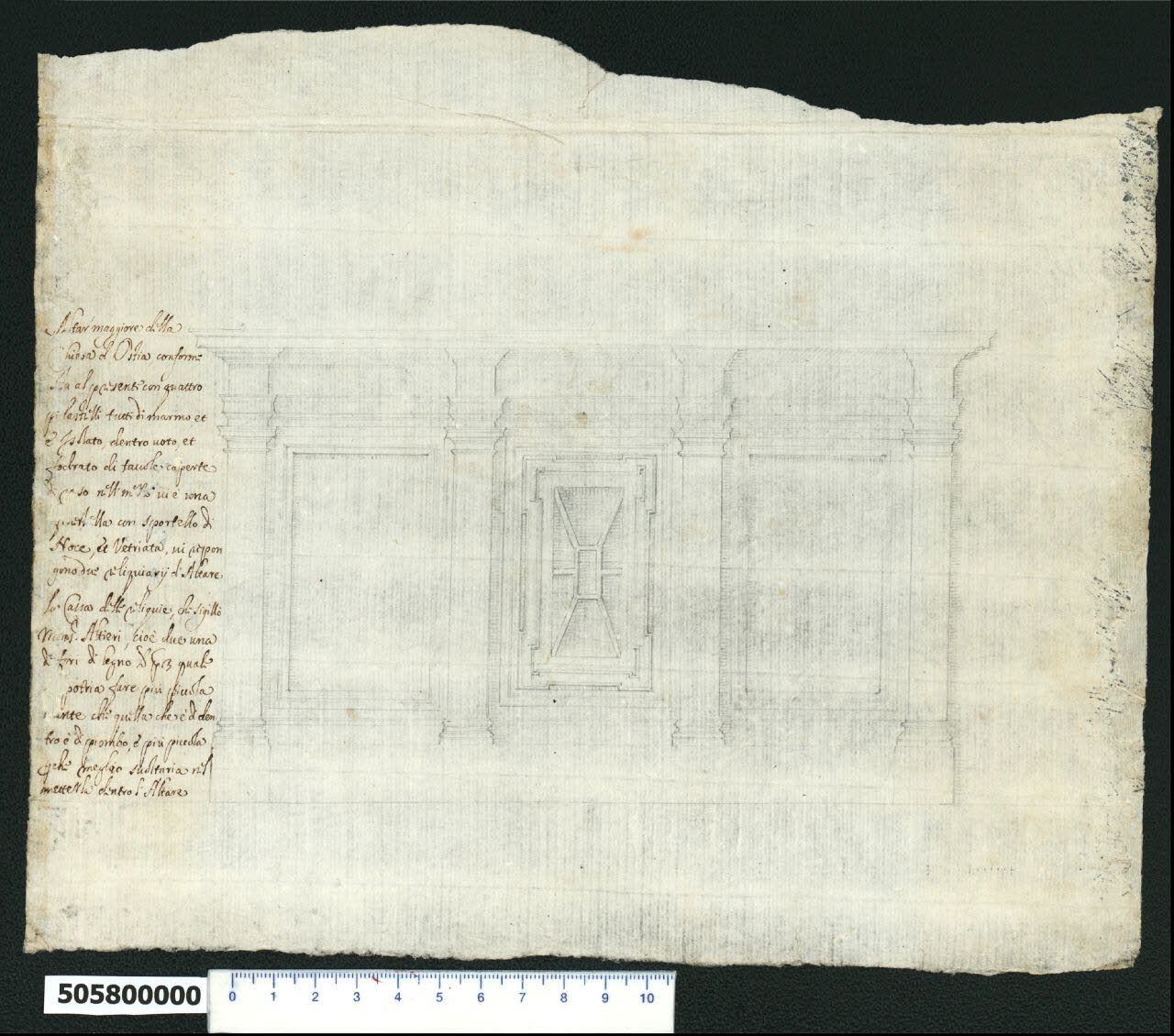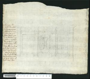 - NOTIZIE STORICO CRITICHE Nell'"Indice de due Tomi d'Intagli Tempietti ed altro", relativo ai tomi V e VI e compilato dal collezionista Giacomo Sardini, il disegno viene iscritto nel paragrafo "altari diversi" con la definizione "55 Paleotto". L'attribuzione del disegno a Giovanni Battista Montano fatta da Valeria Pracchi (1991, 2a parte) su segnalazione di Anna Bedon, è confermata dalla Fairbairn (1998, p. 771), la quale lo individua come credenza. E' la descrizione posta sul margine sinistro che identifica l'oggetto come l'altare maggiore della chiesa di Sant'Aurea a Ostia, principale edificio religioso dell'abitato nel XVII secolo. L'altare, oggi non più visibile perché sostituito da un altro manufatto, si presenta articolato in tre campate da quattro lesene. In quella centrale è inserito lo sportello in legno e vetro del vano entro il quale è riposta la cassa delle reliquie, che, come informa la descrizione posta sul margine sinistro del foglio, venne sigillata dal "monsignor Altieri". Non sono noti rapporti di Montano con la chiesa di Ostia e il riferimento all'Altieri non contribuisce a chiarire il motivo dell'esecuzione di questo rilievo. Due furono i membri della famiglia Altieri che intrapresero la carriera ecclesiastica: Giovanni Battista eletto cardinale nel 1624 ed Emilio, vescovo dal 1627 e papa, col nome di Clemente X dal 1670 al 1676. In entrambi i casi le date sono successive alla morte di Montano (1621).