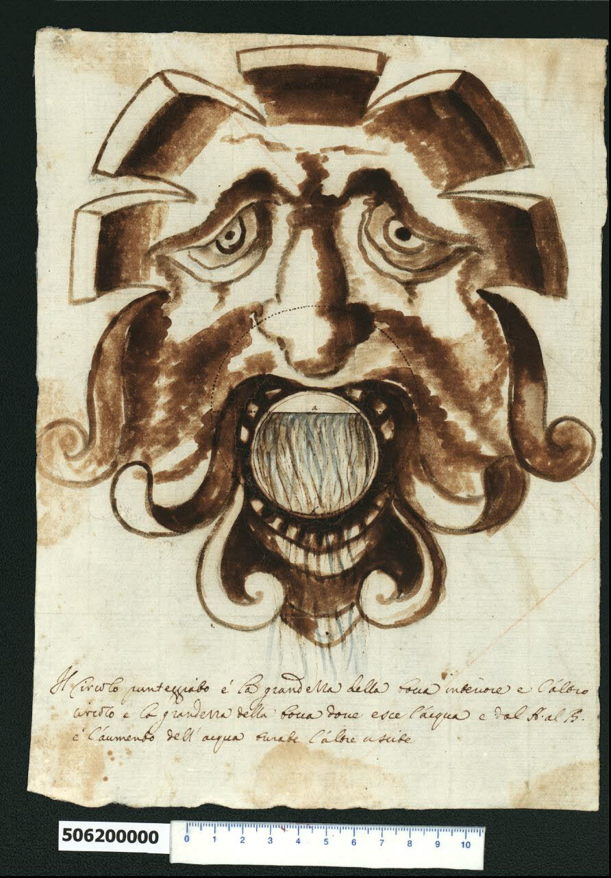 - NOTIZIE STORICO CRITICHE Nell'"Indice de due Tomi d'Intagli Tempietti ed altro", relativo ai tomi V e VI e compilato dal collezionista Giacomo Sardini, il disegno viene iscritto nel paragrafo "Ornati" con la definizione "58 Mascherone". Il disegno, che non è stato possibile identificare, raffigura un mascherone destinato a decorare il foro di uscita dell'acqua di una fontana.