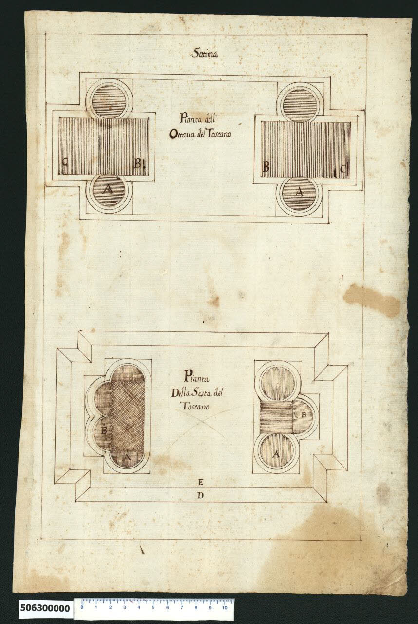 - NOTIZIE STORICO CRITICHE Il disegno raffigura in pianta due soluzioni per sostegni verticali dell'ordine tuscanico. Non è stato possibile stabilire a cosa si riferiscono le scritte "Pianta dell'ottava del toscano" e "Pianta della sesta del toscano". Nel primo disegno due pilastri con colonne addossate per tre quarti poggiano su un basamento cruciforme. Nel secondo disegno, su un basamento che presenta una rastrematura verso l'esterno, sono disegnati a sinistra un pilastro con quattro semicolonne addossate su tre lati, a destra un pilastro due colonne addossate per tre quarti e una semicolonna sul lato esterno. Un disegno che riprende il tema dell'articolazione in pianta dell'ordine toscano è presente in Milano, Collezione Sardini Martinelli inv. 1,17.