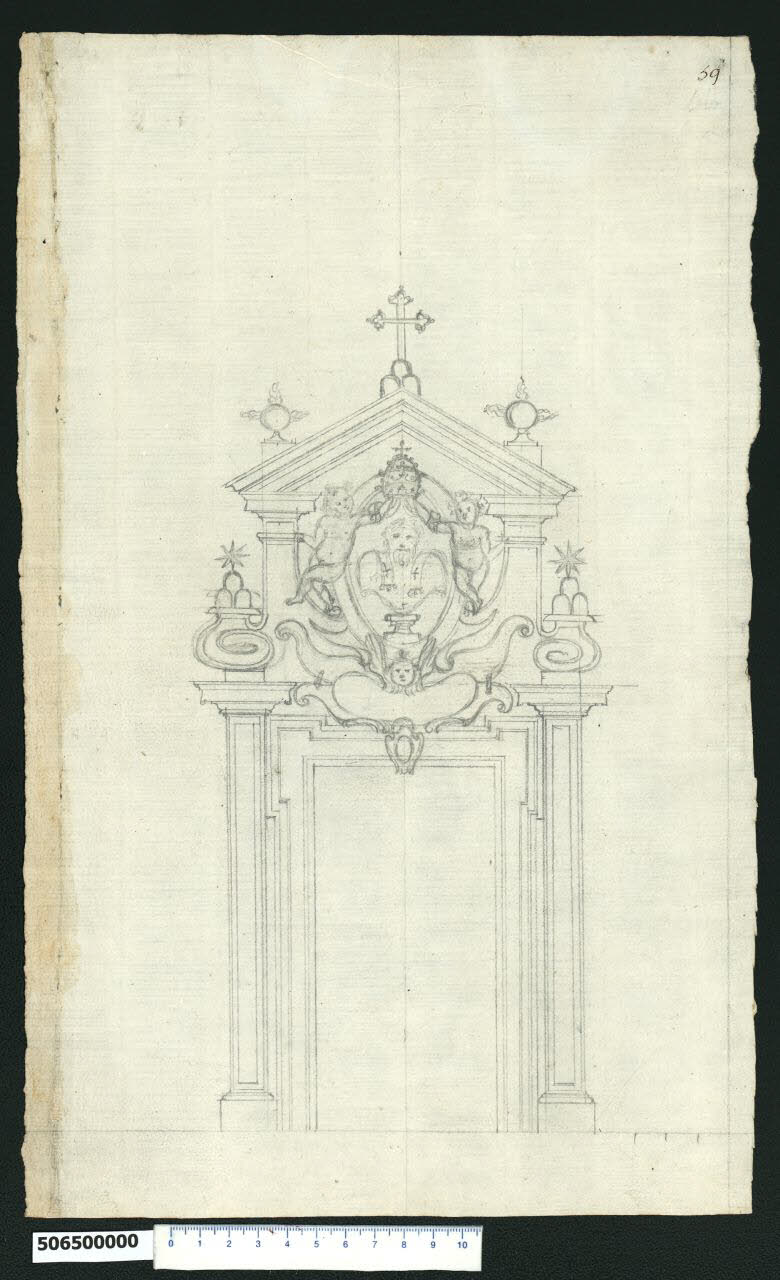 - NOTIZIE STORICO CRITICHE Nell'"Indice de due Tomi d'Intagli Tempietti ed altro", relativo ai tomi V e VI e compilato dal collezionista Giacomo Sardini, il disegno viene iscritto nel paragrafo "Porta" con la definizione "59 schizzo a Lapis".\nQuesto disegno tracciato a grafite si riferisce a un portale per papa Sisto V (1585-1590), identificabile dai segni araldici della famiglia Peretti-Montalto coi tre monti sovrastati da una stella. Non è stato però possibile individuare e localizzare l'opera, attribuita con riserva a Giovanni Battista Montano da V. Pracchi su segnalazione di A. Bedon (Pracchi, 1991 p. 14). Il tratto incerto potrebbe far pensare a un disegno di bottega. Tuttavia non si esclude possa trattarsi di un autore della cerchia di Montano, come ad esempio Martino Longhi il Vecchio, che impiegò lo stesso emblema nella facciata della chiesa di S. Girolamo agli Schiavoni, oggi dei Croati, o suo figlio Onorio che lavorò nelle chiese in cui fu operativo anche Montano .\nL'ingresso, contornato da una cornice sagomata con gli spigoli esterni sporgenti e un piccolo cartiglio nel mezzo dello stipite superiore, è racchiuso tra due piedritti riquadrati poggianti su un dado alla base e raccordati a un tratto di cornice su cui sono impostate, sollevate su un piedritto, due volute schiacciate che, a guisa di mensola, sostengono tre monti sovrastati da una stella. Le volute sono originate dalla struttura del portale, che sostiene con riccioli l'ovale che incornicia il busto del papa posto su un piedistallo. Questa struttura, su cui poggiano pure gli angeli che sorreggono la tiara sopra il capo del pontefice, costituisce allo stesso tempo il supporto del frontone triangolare spezzato che racchiude la composizione. L'ovale è anche sostenuto da una cartella per iscrizione posta sopra la cornice sagomata dell'ingresso, sormontata da una testa di cherubino e da cui si dipartono altri cartigli a ricciolo.\nIl frontone superiore è decorato ai lati da sfere fiammeggianti su piedistalli, corrispondenti ai piedritti sottostanti e al culmine da una croce trilobata su tre monti.\nDi questo soggetto esiste un altro disegno all'interno della Collezione all'inv. 5,112, che costituisce una variante semplificata, ma rifinita ad inchiostro acquerellato, inserita in un ambiente voltato a crociera. Il disegno riporta l'iscrizione "SISTO.V.PONT.MAX.FVNDATORI" e conferma la committenza dell'opera anche di quello in esame.\nSi possono riscontrare analogie stilistiche con altri disegni della presente Collezione (Milano, Collezione Sardini Martinelli invv. 5,126; 5,84; 6,136b e 6,236d).