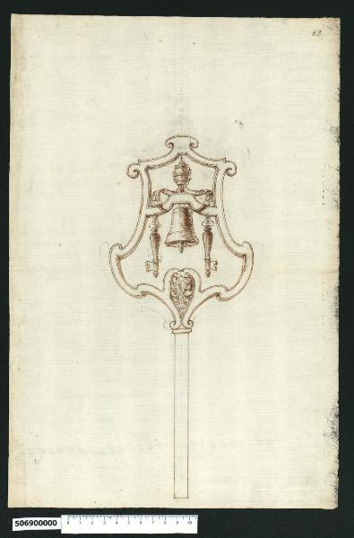 • NOTIZIE STORICO CRITICHE Nell'"Indice de due Tomi d'Intagli Tempietti ed altro", relativo ai tomi V e VI e compilato dal collezionista Giacomo Sardini, il disegno viene iscritto nel paragrafo "Mobili da Chiesa" con la definizione "63 Insegna da Rione". In realtà, come già aveva corretto la Pracchi (1991, 2a parte, p. 15, n. 69) il disegno raffigura una campanella liturgica (tintinnabolo) montata in una targa sagomata issata su un'asta, e divisa internamente in due parti da una barretta orizzontale. Al centro della parte superiore è collocato il triregno dal quale partono due nastri che si raccordano con due chiavi in miniatura. Tra queste ultime, sotto la barretta, è posta una campanella. Attorno al disegno è tracciato a grafite, con tratto leggero, il profilo di un'impugnatura più grande. La campanella viene utilizzata come distintivo proprio delle basiliche.