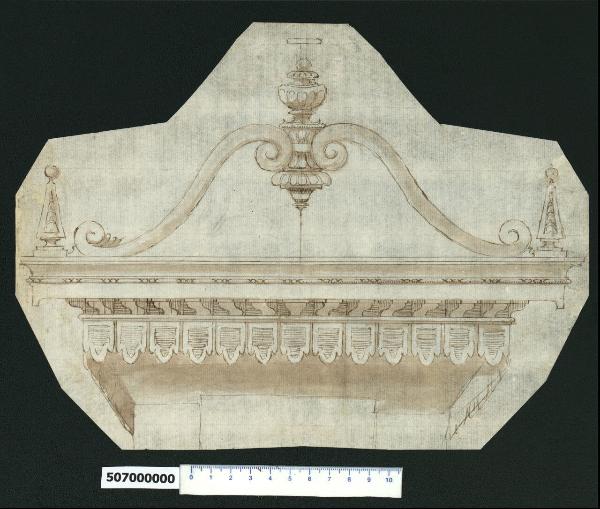 - NOTIZIE STORICO CRITICHE Nell'"Indice de due Tomi d'Intagli Tempietti ed altro", relativo ai tomi V e VI e compilato dal collezionista Giacomo Sardini, il disegno viene iscritto, insieme ad altro foglio contiguo, nel paragrafo "Mobili da Casa" con la definizione "64 Baldacchini".\nIl disegno, tracciato su un foglio poi rifilato seguendone il contorno, raffigura il cielo di un baldacchino. Non è possibile stabilire con certezza a quale funzione fosse adibito. La Fairbairn, che indica il disegno tra quelli di Giovanni Battista Montano, lo inserisce nell'indice tra i "letti" (Fairbairn, 1998 vol. II, Appendix 8, p. 771), ma i baldacchini potevano riferirsi anche ad apparati con funzioni religiose, stabili o provvisorie e il motivo decorativo superiore, assimilabile a un'urna sacramentaria, induce ad attribuirlo in tal senso.\nAnche V. Pracchi, su segnalazione di A. Bedon, indica il disegno come possibile opera di Montano, ma con riserva (Pracchi, 1991 p. 15).\nLa rappresentazione prospettica individua un'impalcatura lignea con travetti sagomati cui è applicata una fascia frontale pure sagomata suddivisa da una sottile cornice a toro. Sopra di essa è impostato un motivo ornamentale costituito ai lati da due elementi torniti a forma di cono su piedistallo sagomato, sovrastati da una sfera e intagliati, da cui si dipartono due listelli arcuati con riccioli di voluta alle estremità, che si innalzano per sostenere e farsi sostenere allo stesso tempo al centro da un elemento concavo, in cui le volute si incastrano, che termina in un pendente decorato a corolla di petali e sostiene l'urna sovrastata da una croce.\nSotto la struttura è appesa una bordura di elementi sagomati secondo i modelli del tempo, riscontrabile anche in un altro disegno presente all'interno della collezione (Milano, Collezione Sardini Martinelli, inv. 8,26). Roma e Firenze sono i centri in cui più facilmente si potevano trovare apparati di questo tipo, utilizzati in occasione delle feste.\nIl disegno può essere confrontato, all'interno della collezione, con quello di cui all'inv. 5,70 bis, probabilmente dello stesso autore.