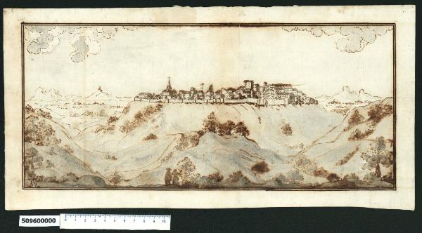 disegno eseguito con inchiostro bruno a penna, a mano libera; i rilievi montuosi, le nuvole, gli alberi e le ombreggiature delle case sono evidenziati con campiture ad acquerello grigio, marcato con acquerellature o sbavature a inchiostro bruno; il disegno è tracciato su carta colore avorio e presenta una doppia marginatura a inchiostro bruno tracciata con tiralinee