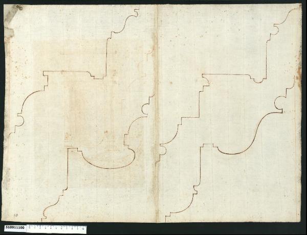 - NOTIZIE STORICO CRITICHE Nell'"Indice de due Tomi d'Intagli Tempietti ed altro", relativo ai tomi V e VI e compilato dal collezionista Giacomo Sardini, il disegno viene iscritto nel paragrafo "Case loro parti" con la definizione "95 Sagoma di cornicione / 96 d.a" [d.a si legga: detta]. Il foglio è attribuito a Giovanni Battista Montano da Valeria Pracchi (1991, 2a parte) su segnalazione di Anna Bedon. Il disegno raffigura quattro profili per sagome di cornici tracciati a inchiostro e uno leggermente delineato con la matita rossa. I disegni sono raggruppabili a due a due, infatti, partendo da sinistra, il primo e il terzo, così come il secondo e il quarto, rappresentano due varianti di altrettante matrici. Rispetto al primo profilo, il terzo differisce per la presenza di una scozia sotto la gola diritta, di un becco di civetta in corrispondenza della rientranza, di dentelli con sottostanti ovuli. Il quarto profilo differisce dal secondo per l'inserimento di una grande gola diritta e di un ovulo in sostituzione della gola rovescia.