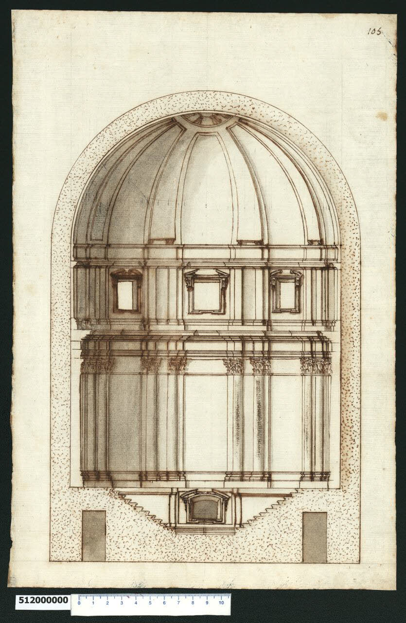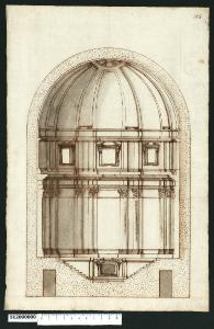 - NOTIZIE STORICO CRITICHE Nell'"Indice de due Tomi d'Intagli Tempietti ed altro", relativo ai tomi V e VI e compilato dal collezionista Giacomo Sardini, il disegno viene iscritto nel paragrafo "Chiese e loro parti" con la definizione "105 Cupola".\nL'edificio, rappresentato in spaccato prospettico, è un mausoleo o cappella di forma circolare. La parte bassa della sezione evidenzia infatti l'esistenza di locali o passaggi sotterranei e comunque una zona centrale ribassata nel pavimento collegata da scale laterali. Sulla parete di fondo si trova una apertura che rappresenta l'ingresso di un sepolcro. \nLa parete al primo livello è scandita da campiture lisce e movimentata da parti rilevate, costituite da coppie di semicolonne affiancate esternamente da mezze lesene, entrambe di ordine corinzio, sollevate su una bassa zoccolatura comune. Una cornice corre lungo la parete all'altezza dei capitelli, sopra i quali è impostata la trabeazione articolata da piedritti e con cornici aggettanti, che sostiene la struttura del secondo livello. Questa, dimezzata in altezza rispetto alla parete inferiore, ne riprende la composizione con campiture corrispondenti, ma con lesene al posto delle semicolonne e con finestre aperte nelle campiture lisce, incorniciate e sormontate da frontoni spezzati, alternativamente triangolari e a voluta. Una seconda trabeazione meno articolata corre sopra la cornice al termine delle lesene e su di essa è impostata la cupola che copre il mausoleo, caratterizzata da costoloni interni che convergono verso un anello centrale strutturale alla sommità. Non è stato possibile identificare l'autore del disegno, che appartiene ad ambito centro-settentrionale. Si possono riscontrare analogie stilistiche con il disegno di inv. 6,152 della Collezione in esame.