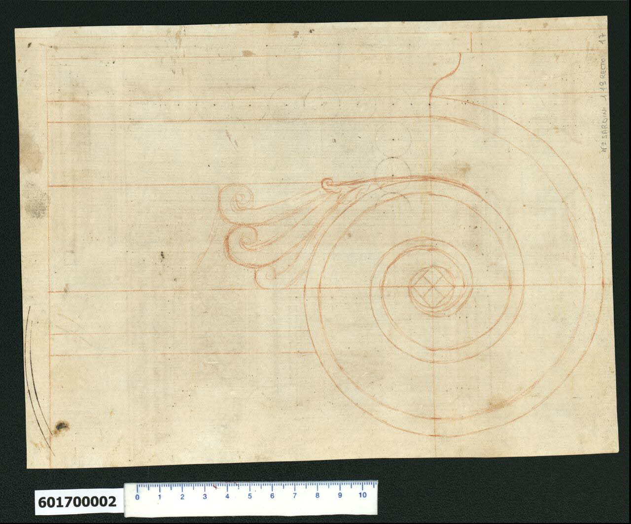- NOTIZIE STORICO CRITICHE Il foglio raffigura la voluta del capitello ionico con la determinazione dei centri all'interno dell'oculus, l'abaco superiore. La voluta presenta un ornato vegetale nell'angolo acuto interno della curva superiore.\nNella Collezione Sardini Martinelli di Milano, sono presenti altri due disegni relativi a questo tema: invv. 6,142a verso e 6,16 verso, che testimoniano dell'interesse nei confronti del metodo di tracciamento di questo elemento. L'individuazione di una formula esatta per la costruzione della voluta ionica aveva impegnato a fondo gli architetti del Rinascimento, che cercavano di sopperire alla mancanza di indicazioni in merito nel testo vitruviano. Quest'ultimo infatti si limitava a descrivere il solo svolgimento esterno della voluta. Leon Battista Alberti prima del 1450 aveva codificato un metodo costruttivo prendendo a modello un capitello del teatro di Marcello. Analogamente fece Serlio prima del 1537, mentre Dürer nel 1525, costruì la spirale attraverso l'individuazione di punti. Solo nel 1540, con Giuseppe Porta Salviati, si avrà la prima voluta costruita secondo il metodo di Vitruvio basato su archi di cerchio di raggi differenti, che costituirà anche la matrice del capitello ionico illustrato da Palladio nell'edizione di Barbaro del 1556 (Gros 2006, p. 29).