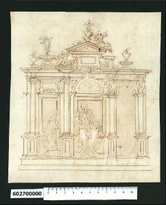 - NOTIZIE STORICO CRITICHE Nell'"Indice de due Tomi d'Intagli Tempietti ed altro", relativo ai tomi V e VI e compilato dal collezionista Giacomo Sardini, il disegno viene iscritto nel paragrafo "Mobili da Chiesa" con la definizione "124 Confessionario".\nIl disegno che è stato attribuito a Giovanni Battista Montano da Valeria Pracchi (1991, 2a parte, p. 18) su segnalazione di Anna Bedon (attribuzione poi confermata anche dalla Fairbairn 1998, p. 770), mostra il prospetto di un confessionale per il quale sono delineate due alternative. A sinistra i due vani, quello del sacerdote e quello del penitente, sono inquadrati da colonne corinzie su alto piedistallo che reggono una trabeazione. Quest'ultima in corrispondenza del vano centrale, è sormontata da un timpano triangolare, spezzato al centro per l'inserimento di un cartiglio, a sua volta con frontone triangolare. Nel vano del penitente, nello spazio compreso tra la porta e la trabeazione, è inserito un cartiglio delimitato da volute. A destra sono previste lesene con capitello dotato di massicce volute che reggono una trabeazione dal fregio decorato. In corrispondenza dell'apertura centrale, accanto al cartiglio con timpano triangolare - alle cui spalle sembra esserci una sorta di attico - è inserita una voluta.\nIl presente foglio va messo in relazione con quello in Milano, Collezione Sardini Martinelli inv. 6,112a.