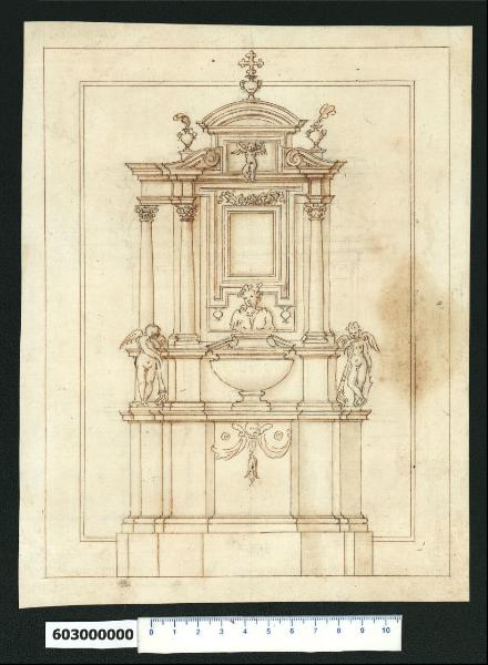 - NOTIZIE STORICO CRITICHE Nell'"Indice de due Tomi d'Intagli Tempietti ed altro", relativo ai tomi V e VI e compilato dal collezionista Giacomo Sardini, il disegno viene iscritto nel paragrafo "Mausolei sepolcrali" con la definizione "125 a colonne in 2 maniere". \nIl foglio in esame presenta il disegno di un monumento funebre a parete con busto in due versioni, già attribuito a Giovanni Battista Montano da V. Pracchi su segnalazione di A. Bedon (Pracchi, 1991 p. 18) e da L. Fairbairn (Fairbairn, 1998 vol. II, Appendix 8, p. 771). \nIl monumento è caratterizzato da un alto basamento articolato, sulla cui parte centrale leggermente avanzata e decorata da un teschio con pendente tra due drappi, si eleva il sepolcro dalla base arrotondata sostenuta da un piedistallo modanato. Il coperchio del sepolcro è costituito da un frontone triangolare interrotto dal sostegno di un busto femminile, probabilmente rappresentante il personaggio cui è dedicato il monumento. Mentre il sepolcro è inquadrato dalle due alte basi delle colonne superiori, affiancate da due angioletti appoggiati a una fiaccola rovesciata, il busto si staglia tra gli elementi discendenti della cornice sagomata che occupa la campitura retrostante tra le colonne e che contiene una seconda cornice rettangolare, probabilmente pensata per un'iscrizione, sovrastata da una ghirlanda. Le colonne sorreggono tramite la trabeazione un frontone interrotto a volute, su cui poggiano due urne fumanti. L'elemento conclusivo, inserito tra le volute, è composto da una riquadratura sagomata sul cui fondo si staglia un putto alato, sormontata da un frontone curvilineo che sostiene una croce trilobata su urna.\nIl progetto presenta sul lato sinistro una possibile variante compositiva, proponendo un'ulteriore colonna laterale libera, che sostiene un tratto di trabeazione con cornicione sporgente raccordato al frontone a volute centrale, formando un motivo a L, la cui base arretrata si trova nascosta dall'angioletto con fiaccola rovesciata.\nIn età tardo antica nei monumenti funerari erano spesso raffigurati amorini o eroti, rappresentati come putti o piccoli geni alati che reggevano una fiaccola rovesciata che si spegne (allegoria della morte); altre volte sostenevano tabelle o clipei (scudi) nei quali era inserito il nome del defunto o una corona o ghirlanda (simbolo di speranza e di vittoria della vita sulla morte). \nIn età medievale le figure degli amorini o eroti, furono reinterpretate in chiave cristiana e furono assimilate agli angeli. L'iconografia degli eroti reggitabella o con la fiaccola rovesciata divenne simbolo di vittoria spirituale e di glorificazione della fede cristiana. \nIl disegno fa parte di una serie di tipologie di monumenti funebri, variate nella composizione degli elementi formali architettonici e decorativi, ideate da Montano e presenti all'interno della Collezione in esame. Anche se non si tratta di disegni riferibili alla produzione di un manufatto specifico, si ritiene di considerarli progetti, in quanto invenzioni compositive. Alcuni di questi disegni, come quello in esame, sono contornati da una doppia marginatura, di cui quella interna, a doppia linea, è tagliata in alto dall'elemento decorativo terminale (in questo caso l'urna con croce trilobata) e in basso dalla zoccolatura del basamento, che sembra poggiare sulla linea inferiore della marginatura esterna (Milano, Collezione Sardini Martinelli invv. 6,36; 6,49; 6,60; 6,69; 6,79; 6,80; 6,88; 6,93). Anche alcuni disegni di cornici (Ibidem, invv. 6,76 e 6,87 a) presentano la stessa doppia marginatura. In altri casi invece è presente solo la marginatura esterna.\nIl foglio presenta tracce a grafite di impostazione del disegno poi ripassato a penna, alcune delle quali, eseguite a tiralinee, sbordanti e tracce di altra soluzione compositiva sottostante forse abbandonata. \nLa soluzione architettonica e decorativa è sicuramente riferibile al repertorio di Montano; non si ha invece certezza sull'esecutore del disegno. La definizione accurata e il tratto formale che lo caratterizzano, si scostano infatti dalla spontaneità e freschezza di altri disegni di Montano. La diversità di stile potrebbe imputarsi allo scopo del disegno stesso (la vendita o la formazione di un album di repertori da pubblicare), o in quanto affidato per la stesura definitiva a un lavorante della sua bottega.\nUn disegno analogo a quello in esame, ma privo di marginature, si trova nel cosiddetto Codice di Parigi, un album lasciato in eredità da Henri de Cambout, Duca di Coislin al Monastero di Saint Germain des Prés nel 1732 (MS Hb, 22 - 4, f. 86v consultato nel microfilm F9389), oggi conservato presso la Bibliothèque National de France a Parigi e segnalato da Lynda Fairbairn (Italian Renaissance Drawings from the Collection of Sir John Soane's Museum, London, 1998 pp. 770-771). Quest'ultimo propone differenze minime, quali la testina di un cherubino, al posto del teschio, tra i drappi e capitelli ionici sulle colonne anziché compositi.