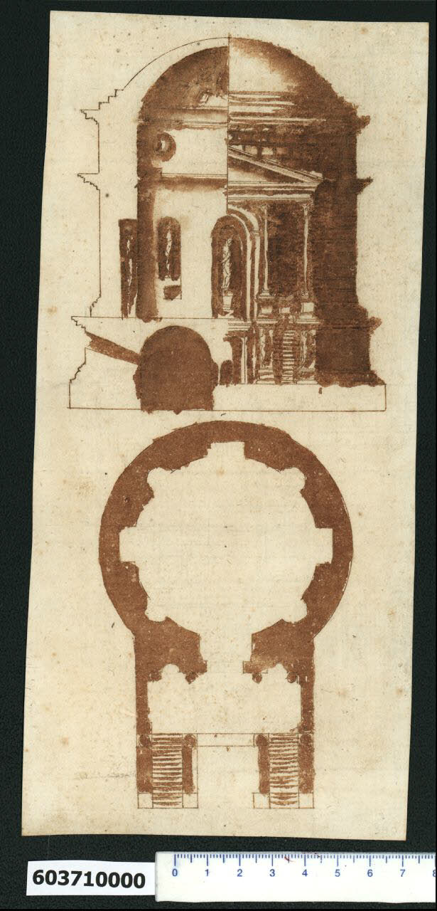 - NOTIZIE STORICO CRITICHE Nell'"Indice de due Tomi d'Intagli Tempietti ed altro", relativo ai tomi V e VI e compilato dal collezionista Giacomo Sardini, il disegno viene iscritto, insieme ad altro foglio, nel paragrafo "Tempietti" con la definizione "129 rotondo d[ett]o quadro antichi".\nL'attribuzione del disegno a Giovanni Battista Montano fatta da Valeria Pracchi (1991, 2a parte, p. 19) su segnalazione di Anna Bedon, è confermata dalla Fairbairn (1998, cat. 1118, pp. 658-659).\nIl disegno mostra la pianta e metà prospetto abbinato a metà sezione, del mausoleo dei Gordiani, che insieme all'Osteria della Torraccia (Milano, Collezione Sardini Martinelli inv. 6,34) fa parte del complesso conosciuto come villa "ad duas lauros", ubicato a est di Roma sulla via Labicana, la cui costruzione risale al IV secolo d.C. La tomba è costituita da un cilindro con nicchie semicircolari e rettangolari alternate, ed è preceduta da un pronao tripartito cui si accede da due rampe di scale laterali con coppia di statue su piedistallo. Colonne corinzie reggono un frontone triangolare e inquadrano le nicchie della parete di fondo. La muratura esterna in bugnato isodomo presenta cornici alla base, all'altezza della trabeazione del pronao e all'imposta della cupola. Queste ultime due cornici sono riproposte anche all'interno a definire una fascia, sorta di tamburo, entro la quale si apre un oculo e sulla quale è adagiata la cupola a cassettoni. Come sostiene Zander (1958, p. 2) la ricostruzione è abbastanza fedele al mausoleo, ad eccezione dell'ordine architettonico, delle statue e del bugnato isodomo, per i quali il rudere non offre elementi di riscontro. Il mausoleo è stato oggetto di studio da parte di molti artisti del Rinascimento, ai quali, probabilmente, Montano si è ispirato (per le altre raffigurazioni cfr. Fairbairn 1998, appendix 5, p. 746).\nUna replica identica del disegno è presente nell'album di Parigi (Bibliothèque Nationale de France, "Recueil de dessins d'architecture par Giovanni Battista Montano", ms Hb, 22-4, f. 66r). Qui la campitura più chiara dell'acquerello rende ben leggibili alcuni dettagli architettonici e decorativi come le colonne poste alla fine delle rampe di scale e ai lati delle nicchie del pronao, le stesse statue e il bugnato isodomo del cilindro. Nessuna variante anche nella tavola inserita nell'opera pubblicata da Soria nel 1624 ("Libro primo Scielta d. varii tempietti antichi con le piante et alzatte disegnati in prospettiva", tav. 18), ripubblicata nell'edizione di De Rossi del 1684 con la discalia "Tempio antico fuori di Porta Maggiore detto Torre di Schiavi passata l'Acqua detta Bullicante" ("Libro Secondo. Scielta D Varii Tempietti Antichi", p. 13). Alcune differenze si riscontrano invece nel disegno conservato a Londra (Sir John Soane's Museum, in Fairbairn 1998, cat. 1118): mancano le colonne alla fine delle scale e ai lati delle nicchie del pronao e il timpano è curvilineo; la parete interna è senza cornici e le nicchie sono prive di statue.