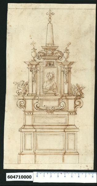 - NOTIZIE STORICO CRITICHE Nell'"Indice de due Tomi d'Intagli Tempietti ed altro", relativo ai tomi V e VI e compilato dal collezionista Giacomo Sardini, il disegno viene iscritto, insieme ad altro foglio già incollato sul lato opposto del medesimo supporto di legatura, nel paragrafo "Mausolei sepolcrali" con la definizione "134 composito ed altro più piccolo".\nIl monumento funebre o cenotafio qui raffigurato presenta una composizione simmetrica rispetto alla mezzeria organizzata su più piani sovrapposti. L'alto basamento presenta due sporgenze laterali con riquadratura incassata come la parte centrale, su cui poggiano i piedritti del secondo e terzo livello che racchiudono rispettivamente una riquadratura e una targa centrale per iscrizione sorretta da un cartiglio con dentelli sottostanti e volute contrapposte. I dentelli si ripetono sotto i piedritti laterali affiancati da volute, che sorreggono la cornice sporgente su cui sono seduti due angioletti che recano una fiaccola rovesciata (sul significato, cfr. Milano, Collezione Sardini Martinelli inv. 6,30). A questo ulteriore livello si trova un'effige a mezzo busto su piedistallo circondata da una cornice sagomata. Ai lati due lesene decorate con cartiglio e pendente, a sostegno della cornice spezzata superiore che porta due urne fumanti. Il rialzo nella parte superiore centrale della cornice sagomata, che contiene un decoro floreale, funge da sostegno all'elemento conclusivo della composizione, costituito una cornice su cui è posto un piedistallo ornato dalla testa di un cherubino con ali a voluta, che sorregge un elemento a forma di obelisco con sfera e croce trilobata superiore.\nQuesto disegno, attribuito a Giovanni Battista Montano da V. Pracchi su segnalazione di A. Bedon (Pracchi, 1991 p. 19) e da L. Fairbairn (Fairbairn, 1998 vol. II, Appendix 8, p. 771), si presenta come il precedente (Milano, Collezione Sardini Martinelli inv. 6,46b) su un foglio evidentemente ritagliato in maniera irregolare che probabilmente presentava una marginatura semplice, oggi limitata alle linee superiore e inferiore.\nLa grafia denota una esecuzione veloce, che induce a considerare il disegno una ideazione tratteggiata da Montano stesso.\nLa composizione è confrontabile con il disegno del Codice di Parigi conservato presso la Bibliothèque National de France (MS Hb, 22 - 4, f. 89r consultato nel microfilm F9394) dove il soggetto è realizzato in due soluzioni rispetto alla mezzeria sotto l'effige diversa a mezzo busto (a sinistra con targa per iscrizione, a destra con sepolcro) e con poche differenze decorative (testine di cherubino con ali ripiegate tra cartigli e pendenti delle lesene). \nAltri disegni all'interno della Collezione (Milano, ibidem, invv. 6,46b; 6,64a; 6,83) e i corrispettivi del Codice di Parigi (MS Hb, 22 - 4, ff. 86 e 92 consultati nei microfilm F9388, F9401) richiamano due elementi caratteristici di questo disegno: l'obelisco con sfera e croce trilobata superiore e la cornice che racchiude (o potrebbe racchiudere) il busto su piedistallo.