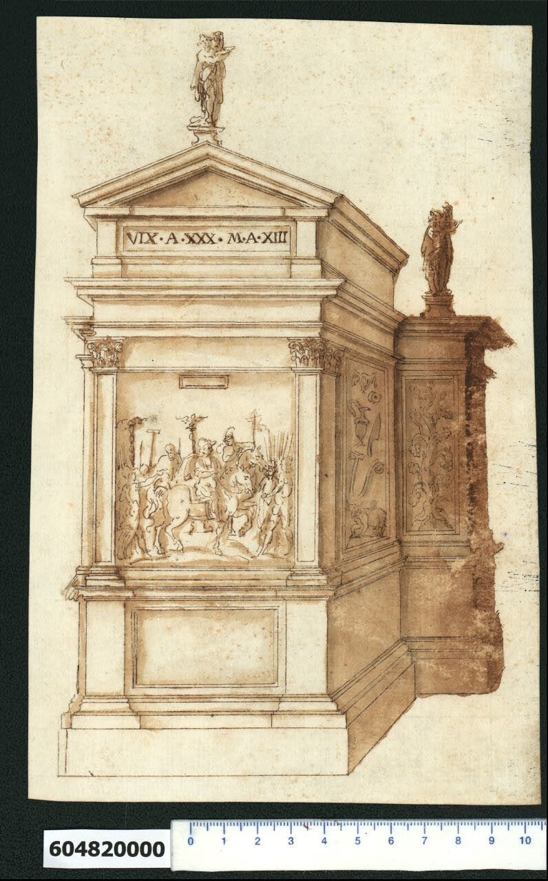 - NOTIZIE STORICO CRITICHE Nell'"Indice de due Tomi d'Intagli Tempietti ed altro", relativo ai tomi V e VI e compilato dal collezionista Giacomo Sardini, il disegno viene iscritto, insieme ad altri due fogli già incollati allo stesso supporto di legatura, nel paragrafo "Mausolei sepolcrali" con la definizione "135 rotondo ed altro quadrato e d[ett]o di faccia".\nIl proposito di disegnare e interpretare i resti dell'architettura antica e in particolare quella di Roma e dei suoi dintorni, comunemente fatto risalire a Brunelleschi, si instaura infatti in diversi architetti e umanisti tra il 1400 e il 1600, tra cui Leon Battista Alberti, Giuliano da Sangallo e il figlio Francesco, Francesco di Giorgio Martini, Fra Giovanni Giocondo, Raffaello, Baldassarre Peruzzi e il figlio Sallustio, Sebastiano Serlio, Antonio Labacco, Pirro Ligorio, Andrea Palladio, Giovanni Antonio Dosio, Guglielmo della Porta e Giovanni Battista Montano.\nGli architetti esplorarono diversi metodi di rappresentazione grafica per i propri disegni, privilegiando in alcuni casi la raffigurazione ortogonale (prescritta dall'Alberti) o sperimentando la vista prospettica, riproducendo gli edifici in scala con misure e dettagli o tutti della stessa misura (come in Guglielmo della Porta), con la pianta sovrastata da metà elevazione e metà sezione nella maniera prescritta da Raffaello.\nAnche il collezionismo di disegni architettonici divenne presto una pratica comune, non solo tra gli umanisti e i loro protettori, ma anche tra gli stessi architetti. I disegni, in originale o in copia, erano conservati in genere con il proposito di illustrazione in libri stampati, come risorsa per studi accademici, per creare repertori utili al proprio lavoro o per preservare il lavoro di riproduzione del proprio maestro. \nLe fonti dei disegni potevano essere la visione diretta, ma anche la copia da disegni e ricostruzioni precedenti o descrizioni tratte da fonti letterarie e perfino incisioni su monete. I disegni, riprodotti a volte in più copie, venivano redatti anche per la vendita.\nQuesto disegno, attribuito a Giovanni Battista Montano da V. Pracchi su segnalazione di A. Bedon (Pracchi, 1991 p. 19) e indicato da L. Fairbairn (Fairbairn, 1998 vol. II, Appendix 8, p. 771),\nfa parte di una serie di ricostruzioni archeologiche arbitrarie di edifici antichi, studiati forse in parte direttamente o attraverso disegni e stampe di altri architetti, contaminate da soluzioni compositive e formali anche tratte dal contemporaneo repertorio manierista. Gli edifici, privi di riferimenti dimensionali e avulsi dal contesto, appaiono come immagini e meditazioni formali, senza alcuna velleità di documentazione storica. Il patrimonio archeologico è visto quindi principalmente come fonte di repertori da cui trarre ispirazione.\nLa tomba romana rappresentata in prospettiva, di cui sono visibili la fronte e il lato destro, non è identificabile. Il manufatto, che probabilmente ha una forma in pianta a T dovuta a un corpo principale e due ali aggettanti più basse nella parte posteriore, si eleva su una zoccolatura e un alto basamento. Quest'ultimo sporge sulla fronte del corpo principale costituendo i piedistalli delle paraste angolari superiori ornati da capitelli corinzi, che anteriormente sono uniti da una fascia orizzontale. Tra i piedistalli è una riquadratura liscia incassata, mentre le paraste, pure riquadrate, racchiudono dei pannelli con bassorilievi, di cui quello frontale raffigurante cavalieri e soldati che portano stendardi e armi e quello laterale degli attrezzi con un bue. Un altro pannello con un albero pure a bassorilievo, decora il corpo edilizio sporgente più basso, forse leggermente staccato volumetricamente dal corpo principale e concluso da una copertura piana sovrastata da una statua su piedistallo. Il corpo principale presenta invece sopra la trabeazione e la cornice un basso attico contenente un'iscrizione frontale ed è concluso da una copertura a falde individuata da un frontone triangolare sormontato da una statua su piedistallo.\nIl disegno del Soane's Museum di Londra (Fairbairn, 1998 vol. II, p. 691 n. 1207) propone lesene decorate.