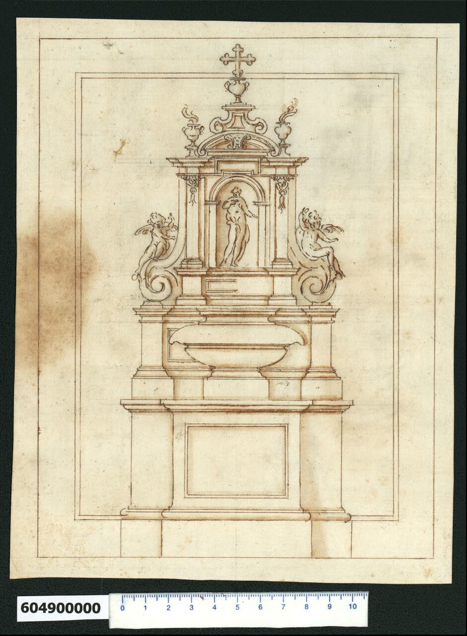 - NOTIZIE STORICO CRITICHE Nell'"Indice de due Tomi d'Intagli Tempietti ed altro", relativo ai tomi V e VI e compilato dal collezionista Giacomo Sardini, il disegno viene iscritto, insieme ad altri due fogli già incollati allo stesso supporto di legatura, nel paragrafo "Mausolei sepolcrali" con la definizione "135 rotondo ed altro quadrato e d[ett]o di faccia".\nIl monumento funebre qui raffigurato presenta una composizione simmetrica rispetto alla mezzeria, organizzata su tre livelli.\nL'alto basamento con zoccolatura a pavimento è avanzato nella parte centrale decorata con riquadratura per costituire una sorta di altare, su cui è posto il sepolcro di forma curvilinea sollevato su un piedistallo, inquadrato da due piedritti e con una base superiore dove poter collocare una scultura.\nNella parte superiore maggiormente decorata si trova una sorta di edicola, sorretta ai lati da due grandi volute su cui siedono leggiadri angioletti, costituita da una nicchia semicircolare con statua drappeggiata al centro, inquadrata da un arco e affiancata da lesene decorate da pendenti. Sopra l'arco è una targa sagomata per iscrizione sormontata da un frontone curvilineo a volute terminali. Al centro del frontone è posto un cartiglio, ai lati due urne fumanti, mentre nella parte superiore è un basamento con volute che sostiene una croce posta su un'urna. \nIl disegno, attribuito a Giovanni Battista Montano da V. Pracchi su segnalazione di A. Bedon (Pracchi, 1991 p. 19) e da L. Fairbairn (Fairbairn, 1998 vol. II, Appendix 8, p. 771), è incorniciato come altri di analogo soggetto (Milano, Collezione Sardini Martinelli invv. 6,30; 6,36; 6,60; 6,69; 6,79; 6,80; 6,88; 6,93) da una doppia marginatura, di cui quella interna, a doppia linea, è tagliata in alto dall'elemento decorativo terminale (l'urna con croce trilobata simile a quella del disegno di cui all'inv, 6,30) e in basso dalla zoccolatura del basamento, che sembra poggiare sulla linea inferiore della marginatura esterna.\nIl disegno presenta tracce a grafite di impostazione della composizione poi ripassata a penna, tra cui alcune linee costruttive sbordanti eseguite a tiralinee. La soluzione architettonica e decorativa è sicuramente invenzione di Montano; non si ha invece certezza sull'esecutore del disegno, che potrebbe anche essere un lavorante della sua bottega.