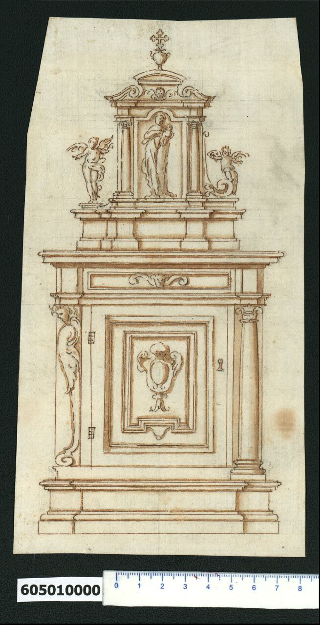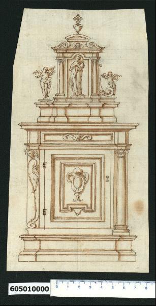 - NOTIZIE STORICO CRITICHE Nell'"Indice de due Tomi d'Intagli Tempietti ed altro", relativo ai tomi V e VI e compilato dal collezionista Giacomo Sardini, il disegno insieme ad altri fogli già incollati sul lato opposto del medesimo supporto di legatura, viene iscritto nel paragrafo "Banchi" con la definizione "136 in tre maniere".\nIl foglio in esame presenta il progetto di un arredo ecclesiastico, con due diverse soluzioni decorative ai lati.\nLa base presenta cornici modanate ed è avanzata nella parte centrale. Lo sportello, dotato di cerniere e di toppa per la chiave, è decorato da una doppia cornice incassata, di cui quella più interna sagomata e sostenuta da una piccola mensola. Nella campitura centrale una cartella ornata con cartiglio a sinistra, ala abbassata a destra e pendente alla base. Ai lati dello sportello si propongono a sinistra una cariatide in forma di angelo con ali abbassate e voluta alla base, a destra una colonna su base sagomata con capitello ionico. Questi elementi portano l'appoggio, concepito come una sorta di trabeazione con riquadratura centrale incassata e decorata da una testina di leone tra volute, per la decorazione superiore, che si presenta come un piccolo altare.\nSopra una sorta di basamento articolato da appoggi è impostata una edicola con l'immagine della Madonna con Bambino inquadrata in una cornice sagomata, affiancata da due colonne che sostengono tramite piedritti un frontone a volute contrapposte, al centro del quale è un piedistallo sormontato da un frontone curvilineo. Quest'ultimo è decorato alla base da una testina di cherubino e superiormente da una croce trilobata su urna. Sul lato sinistro l'edicola è affiancata dalla figura di un angelo, mentre a destra è sostenuta da una voluta vegetale su cui poggia un putto alato. \nLa soluzione architettonica e decorativa sembra essere invenzione di Montano; non si ha invece certezza sull'esecutore del disegno, che potrebbe anche essere un lavorante della sua bottega.\nIl disegno è attribuito a Montano da V. Pracchi su segnalazione di A. Bedon (Pracchi, 1991 p. 19) , ma non indicato da L. Fairbairn (Italian Renaissance Drawings from the collection of Sir John Soane's Museum, 1998).\nUn disegno analogo è presente nel Codice di Parigi (MS Hb, 22 - 4, f. 43 consultato nel microfilm F 9398), ma anche questo non è indicato da L. Fairbairn. Quest'ultimo risulta più rifinito nei dettagli decorativi e presenta due angioletti sulle volute del frontone superiore.