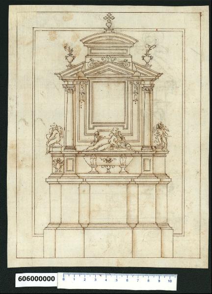 - NOTIZIE STORICO CRITICHE Nell'"Indice de due Tomi d'Intagli Tempietti ed altro", relativo ai tomi V e VI e compilato dal collezionista Giacomo Sardini, il disegno, benché già incollato sul supporto di legatura con numero antico 141, viene iscritto nel paragrafo "Mausolei sepolcrali" con la definizione "140 con due colonne".\nIl foglio in esame presenta il disegno di un monumento funebre a parete simmetrico secondo la mezzeria, con un alto basamento articolato impostato su una robusta zoccolatura. La rappresentazione, quasi priva di ombreggiature, non consente di stabilire esattamente la profondità della composizione anche se si presume che l'elemento centrale su cui è posto il sepolcro sia avanzato. Quest'ultimo ha il fondo decorato da una testa di cherubino ed è sollevato su due supporti sagomati tra cui si ravvisa un motivo a pendente, mentre sopra il coperchio è adagiata una figura femminile semisdraiata e appoggiata su un cuscino. Ai suoi piedi è accennata la figura di un piccolo cherubino. Il sepolcro è compreso tra i supporti riquadrati delle due colonne ioniche soprastanti, ai cui lati si trovano due angioletti seduti su un piedistallo. A lato del supporto di sinistra è disegnata una cartella gentilizia, che non compare sul versante opposto. Le colonne sostengono un frontone triangolare interrotto sovrastato da urne fumanti e tra le stesse, al di sopra del sepolcro, è impostata una doppia cornice sagomata, di cui quella esterna decorata superiormente da pendenti vegetali e quella interna sormontata da un frontone triangolare decorato nell'estradosso con doppio motivo a volute. Sopra questo motivo si innalza l'elemento terminale della composizione: una doppia base rettangolare, di cui la superiore riquadrata e un frontone curvilineo sormontato da un'urna con croce trilobata su piedistallo.\nIl disegno, attribuito a Giovanni Battista Montano da V. Pracchi su segnalazione di A. Bedon (Pracchi, 1991 p. 19) e da L. Fairbairn (Fairbairn, 1998 vol. II, Appendix 8, p. 771), è incorniciato come altri di analogo soggetto (Milano, Collezione Sardini Martinelli invv. 6,30; 6,36; 6,49; 6,69; 6,79; 6,80; 6,88; 6,93) da una doppia marginatura, di cui quella interna, a doppia linea, è tagliata in alto dall'elemento decorativo terminale (l'urna con croce trilobata) e in basso dalla zoccolatura del basamento, che sembra poggiare sulla linea inferiore della marginatura esterna.\nIl foglio presenta tracce a grafite di impostazione del disegno poi ripassato a penna, alcune delle quali, eseguite a tiralinee, sbordanti e tracce di altra soluzione compositiva sottostante forse abbandonata. \nLa soluzione architettonica e decorativa è sicuramente riferibile al repertorio di Montano; non si ha invece certezza sull'esecutore del disegno. \nLa definizione accurata e il tratto formale che lo caratterizzano, si scostano infatti dalla spontaneità e freschezza di altri disegni di Montano. La diversità di stile potrebbe imputarsi allo scopo del disegno stesso (la vendita o la formazione di un album di repertori da pubblicare), o in quanto affidato per la stesura definitiva a un lavorante della sua bottega.\nEsso è confrontabile con un disegno del Codice di Parigi (MS Hb, 22 - 4, f. 89v consultato nel microfilm F9395) completo nella simmetria.